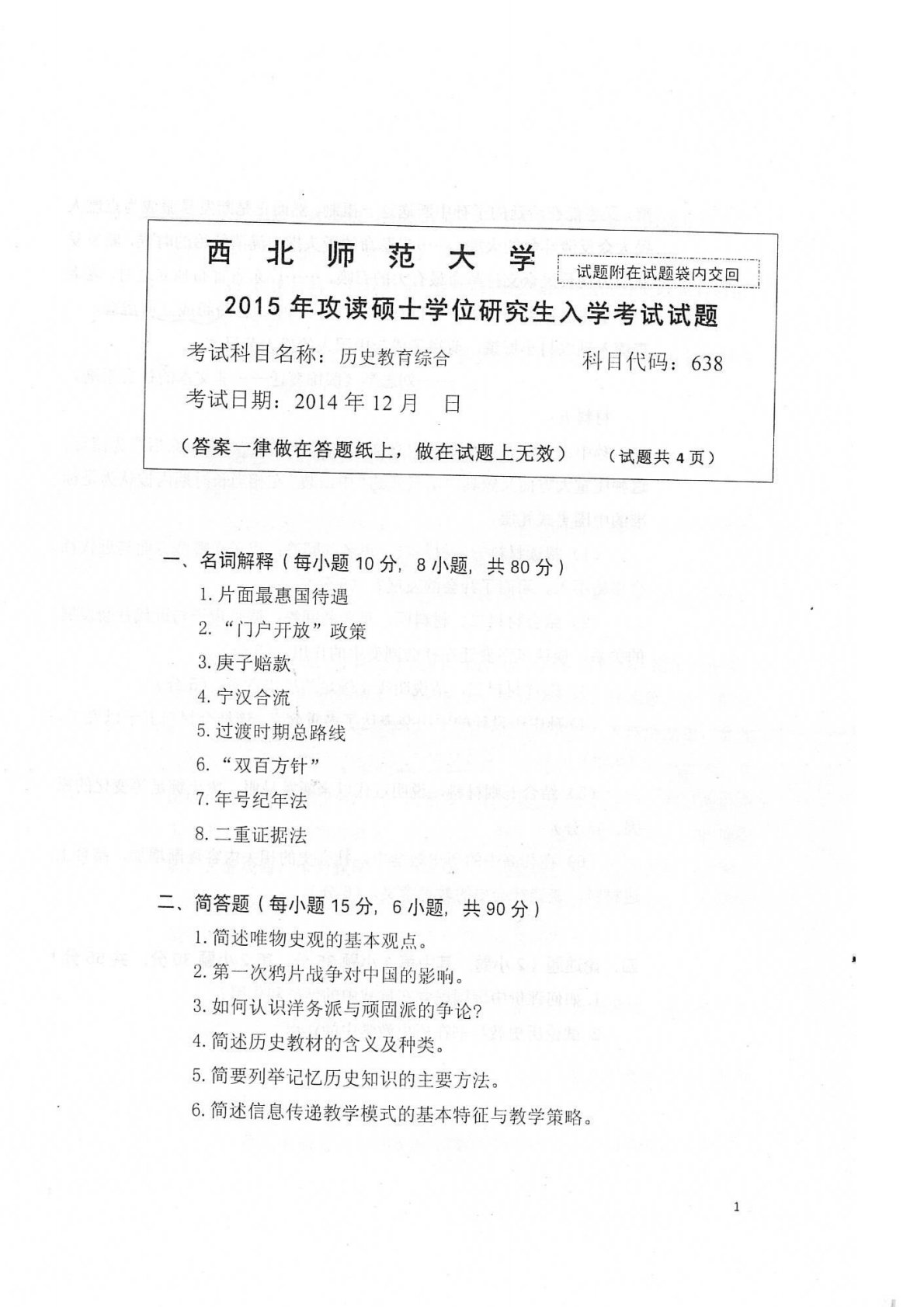 西北师范大学638历史教育综合(复试)2015年真题