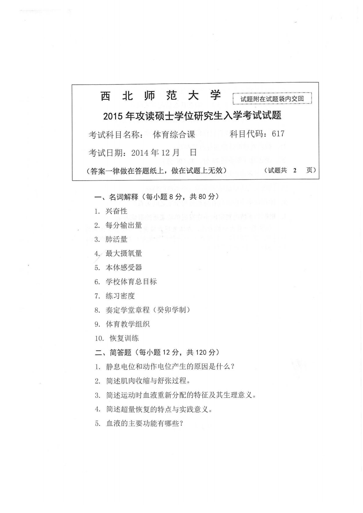 西北师范大学617体育综合课2015年真题