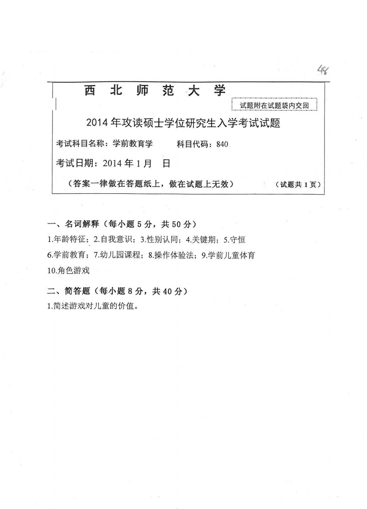 西北师范大学840学前教育学2014年真题