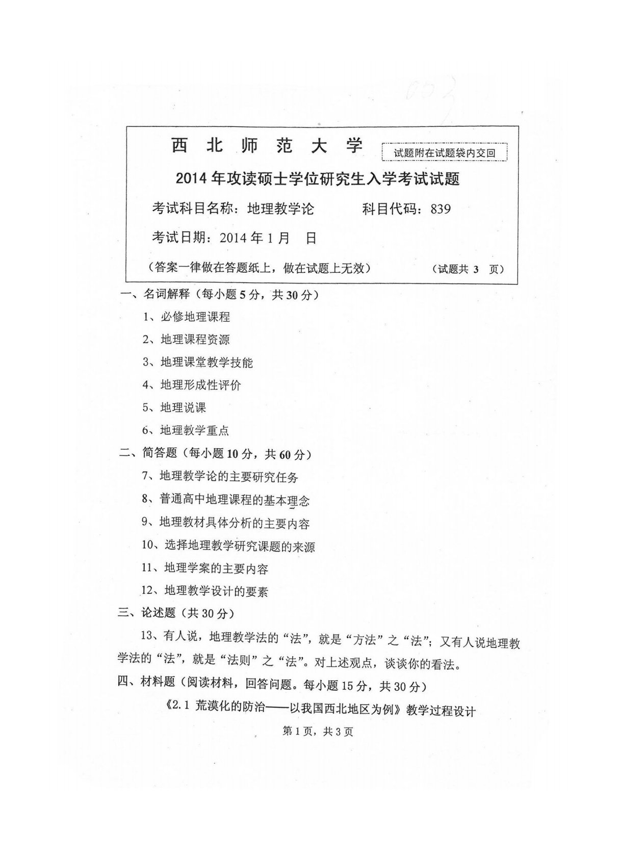西北师范大学839地理教学论2014年真题