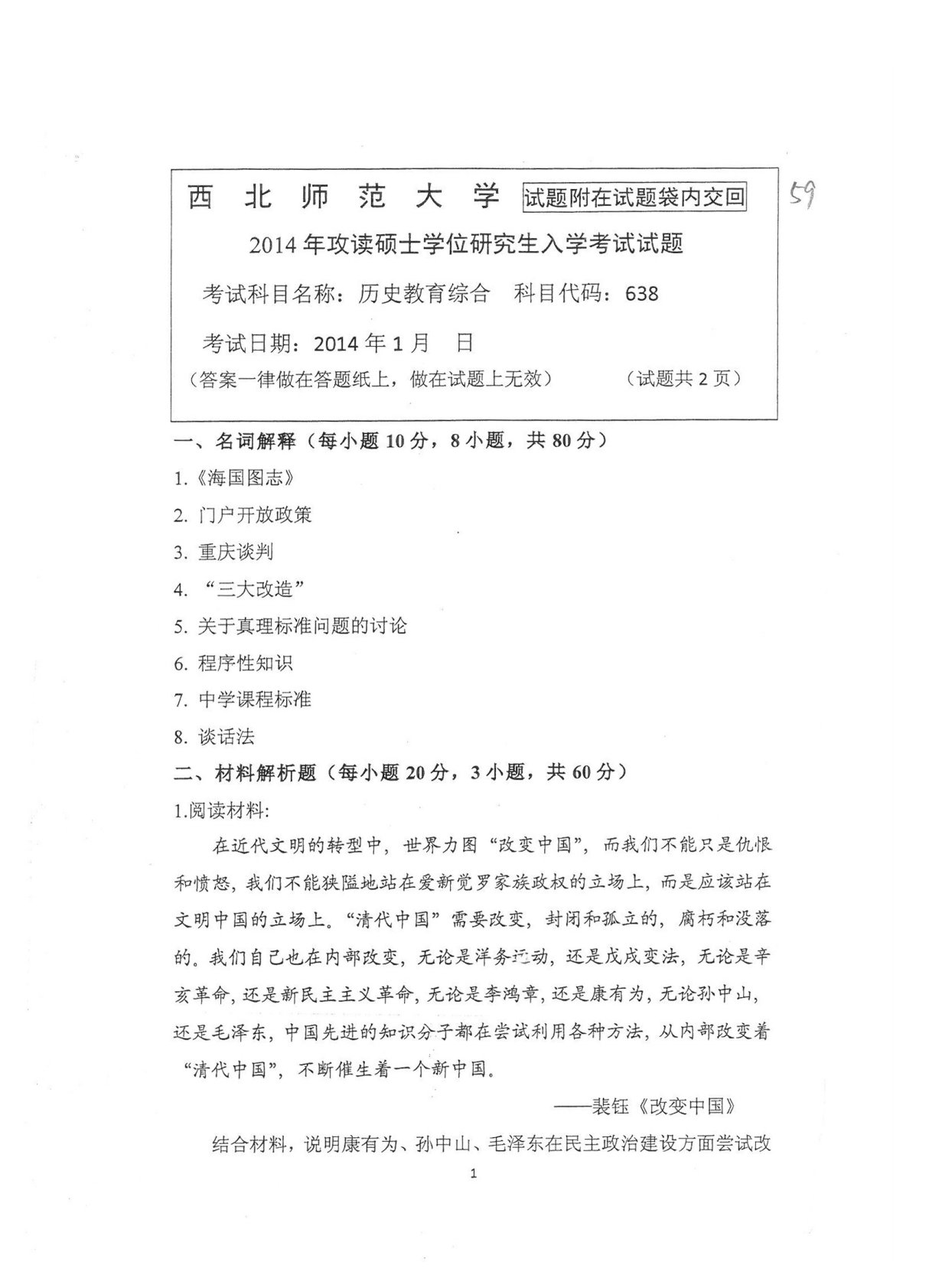 西北师范大学638历史教育综合(复试)2014年真题