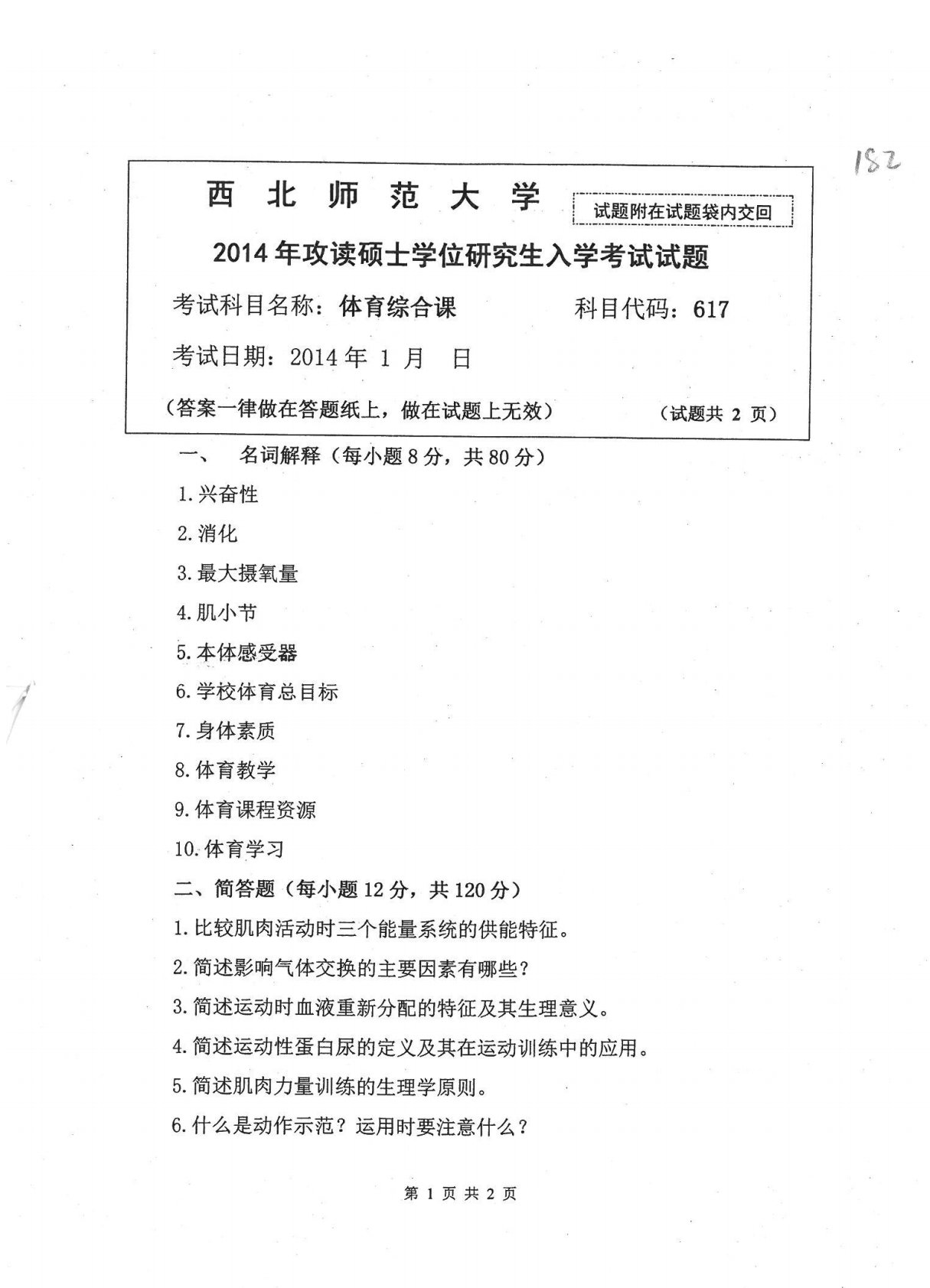 西北师范大学617体育综合课2014年真题