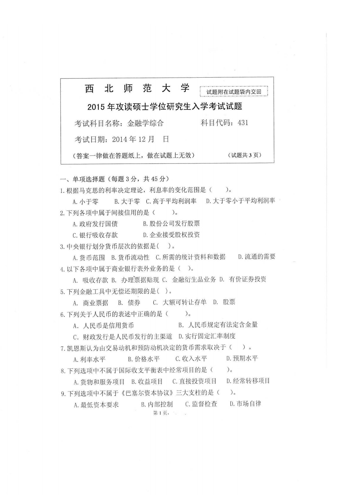 西北师范大学431金融学综合2015年真题