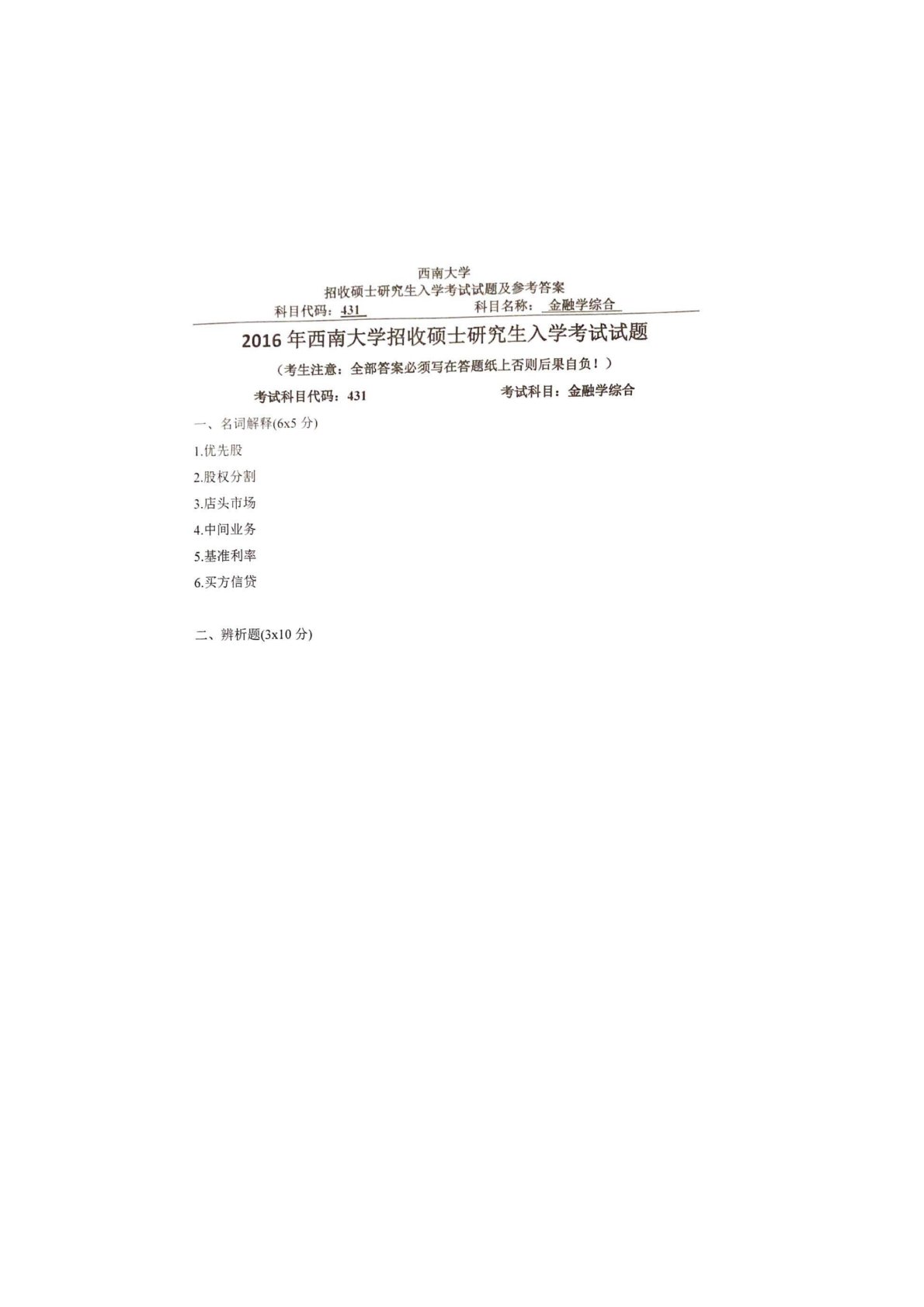 西南大学431金融学综合2016年真题