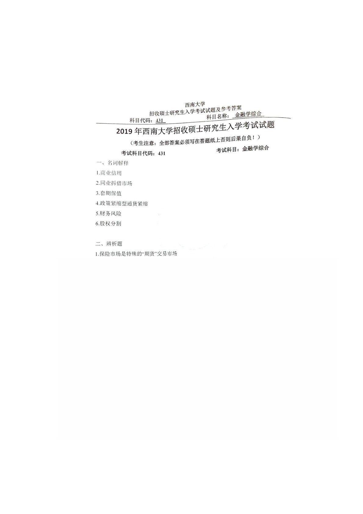 西南大学431金融学综合2019年真题
