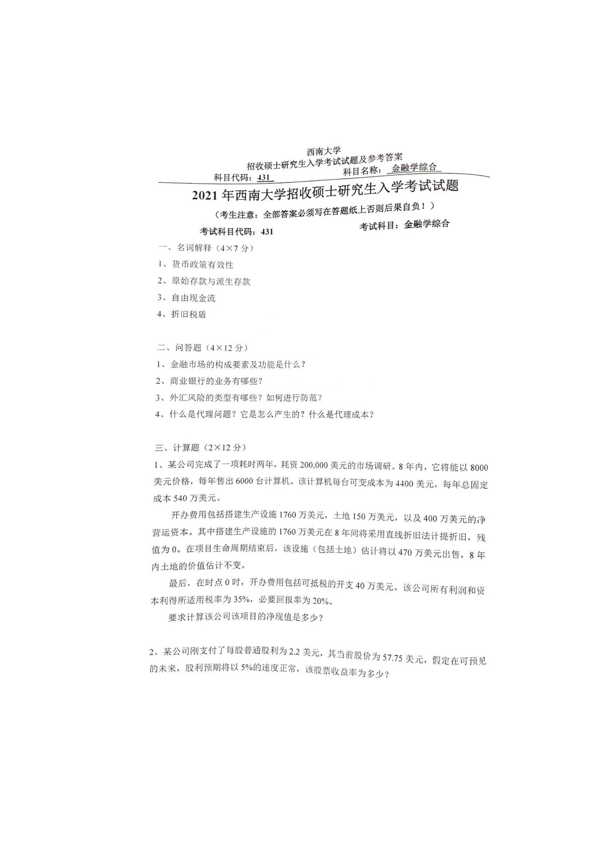 西南大学431金融学综合2021年真题