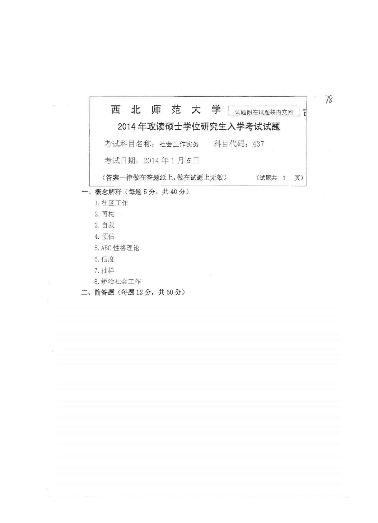 西北师范大学437社会工作实务2014年真题