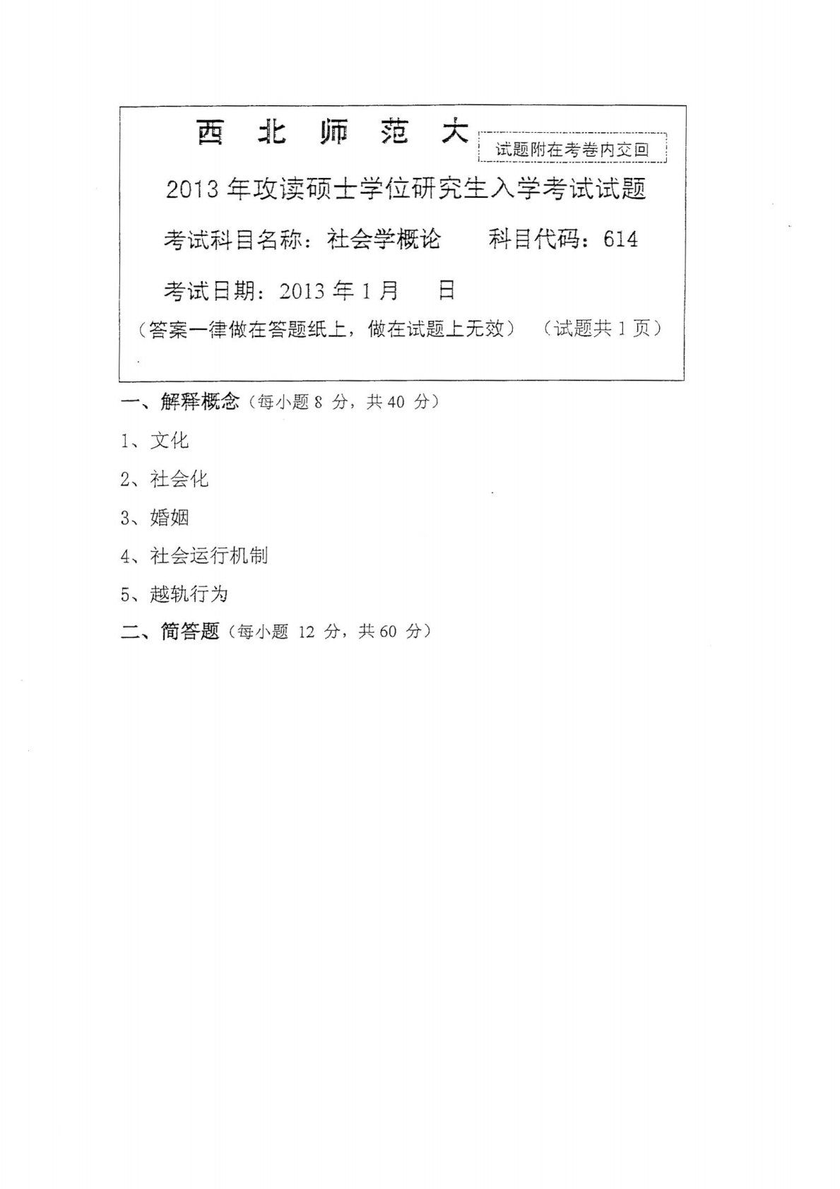 西北师范大学614社会学概论2013年真题