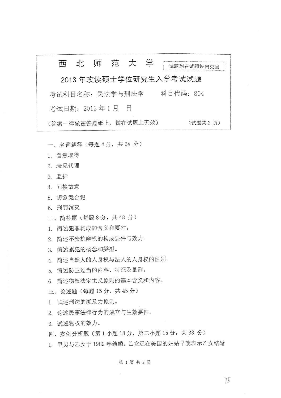 西北师范大学804民法学与民事诉讼法学2013年真题