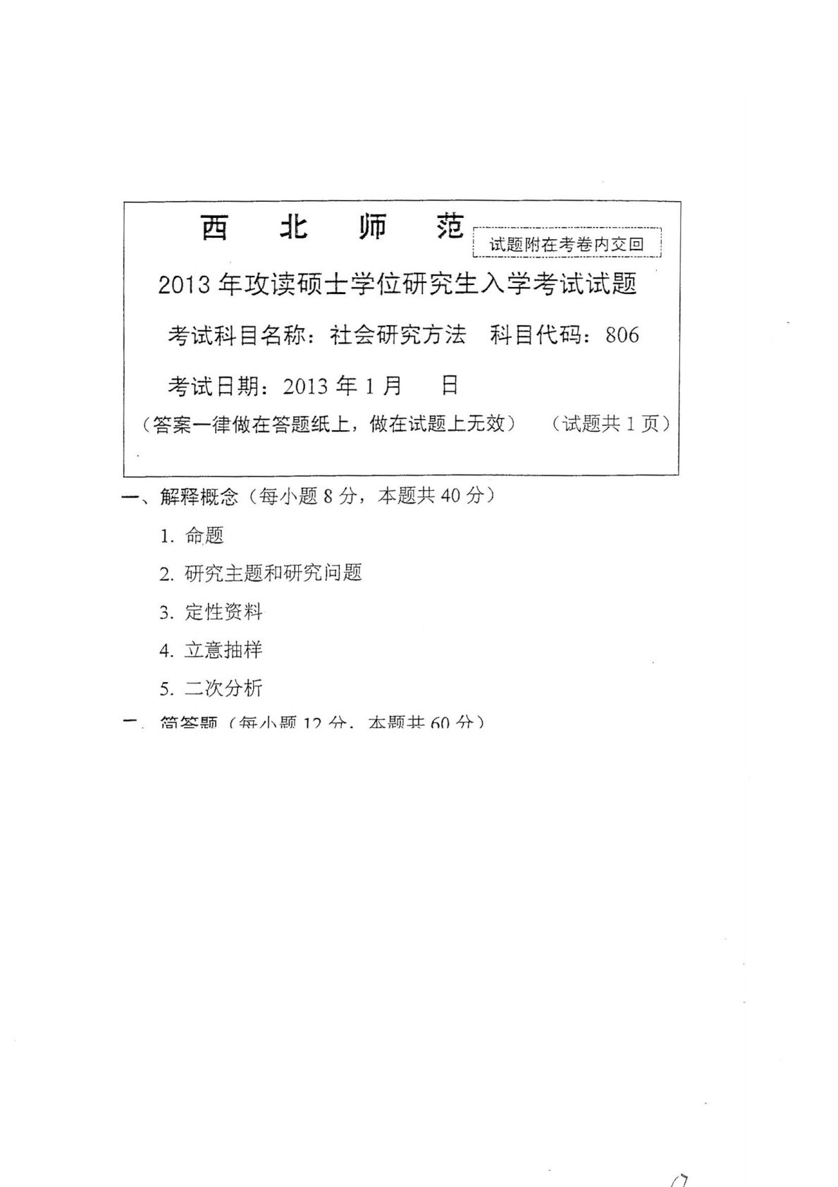 西北师范大学806社会研究方法2013年真题