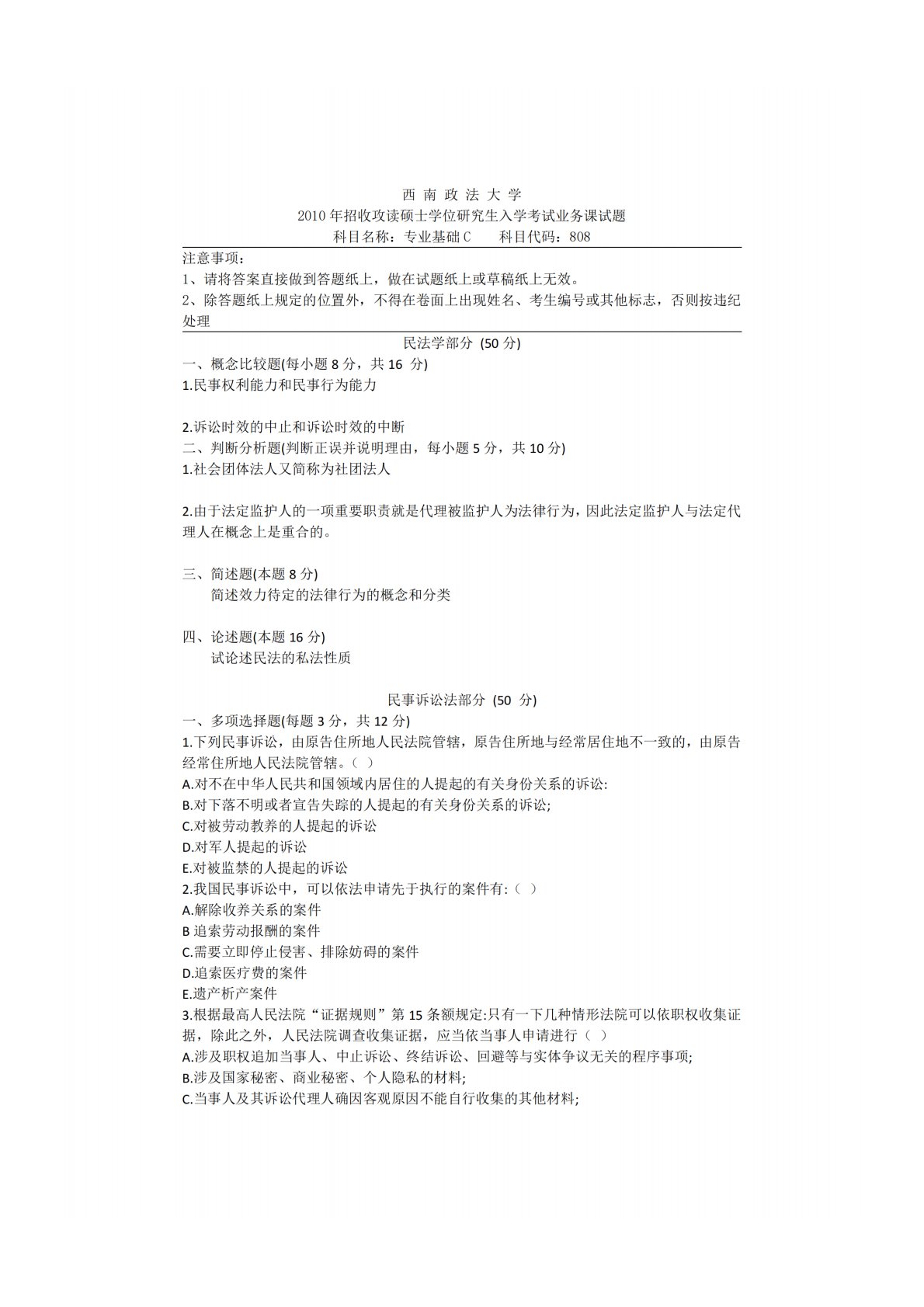 西南政法大学808专业基础C(民法学(民法总则、人格权法、物权法、合同法、侵权责任法)、经济法学(经济法基本理论、市场秩序规制法律制度)、民事诉讼法)2010年真题
