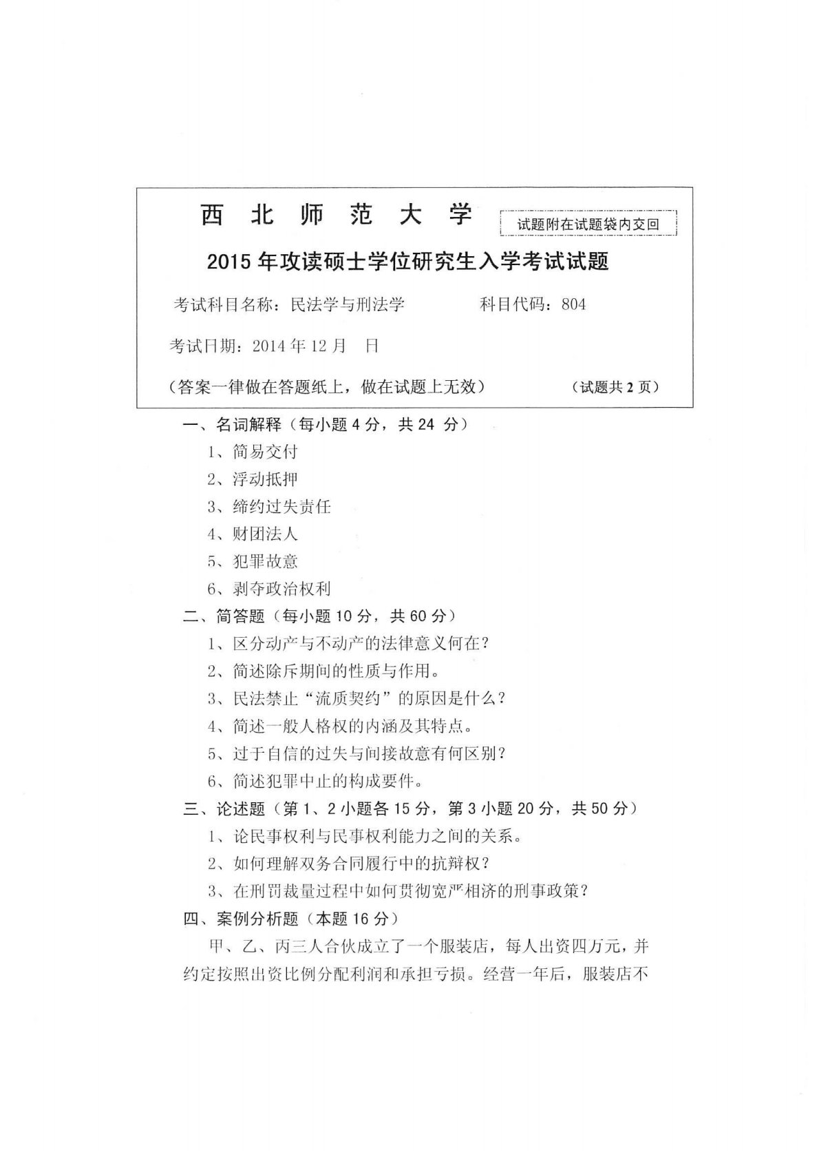 西北师范大学804民法学与民事诉讼法学2015年真题