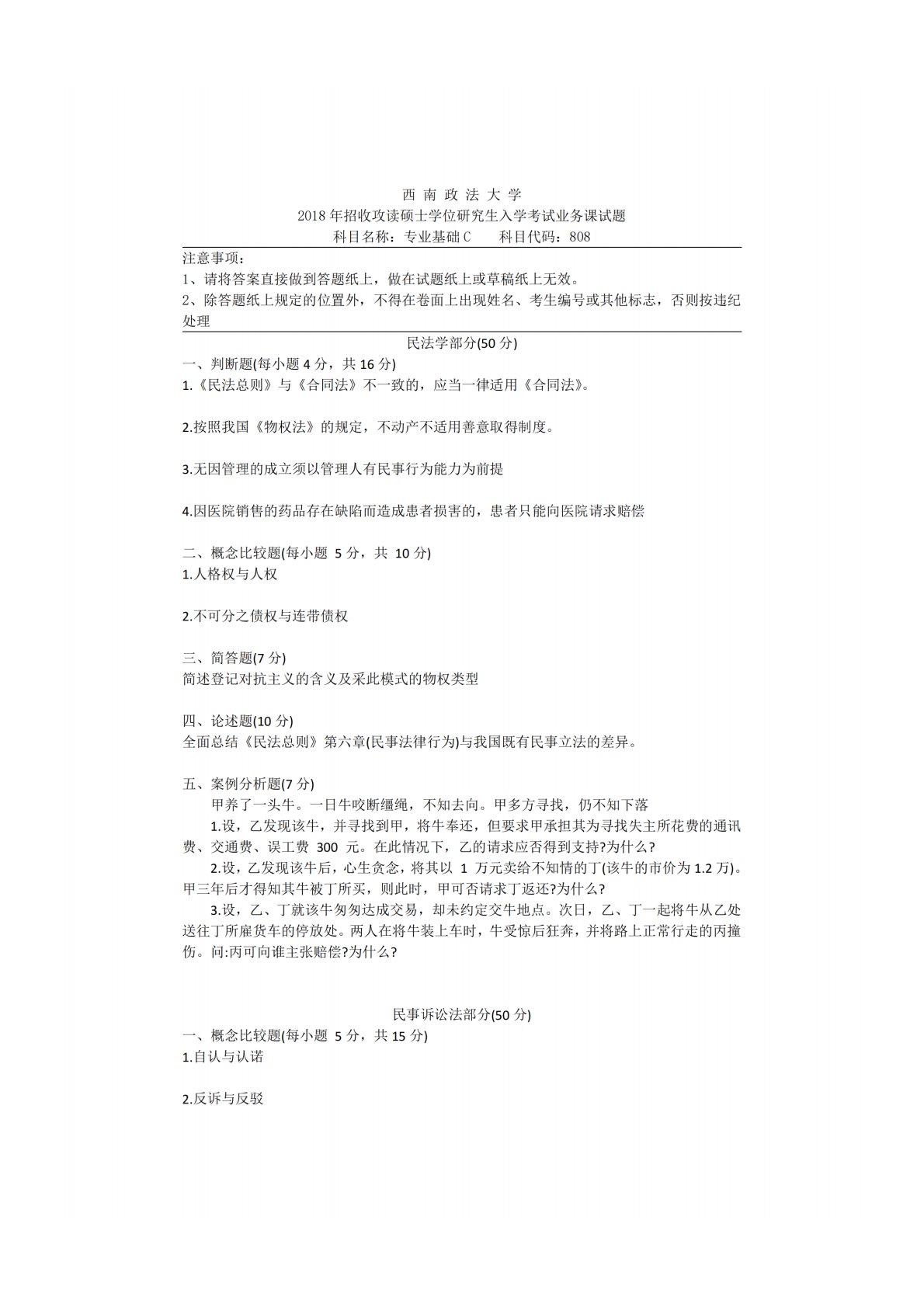 西南政法大学808专业基础C(民法学(民法总则、人格权法、物权法、合同法、侵权责任法)、经济法学(经济法基本理论、市场秩序规制法律制度)、民事诉讼法)2018年真题