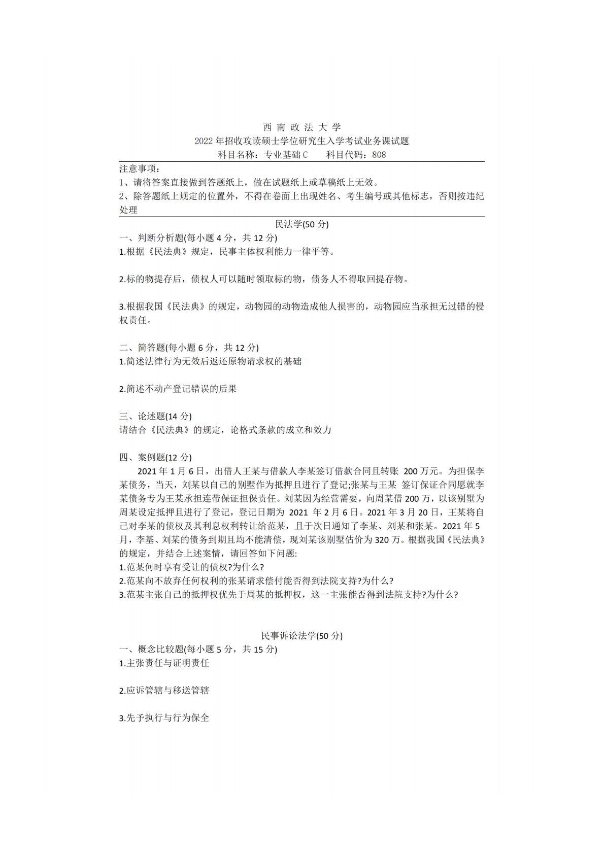西南政法大学808专业基础C(民法学(民法总则、人格权法、物权法、合同法、侵权责任法)、经济法学(经济法基本理论、市场秩序规制法律制度)、民事诉讼法)2022年真题