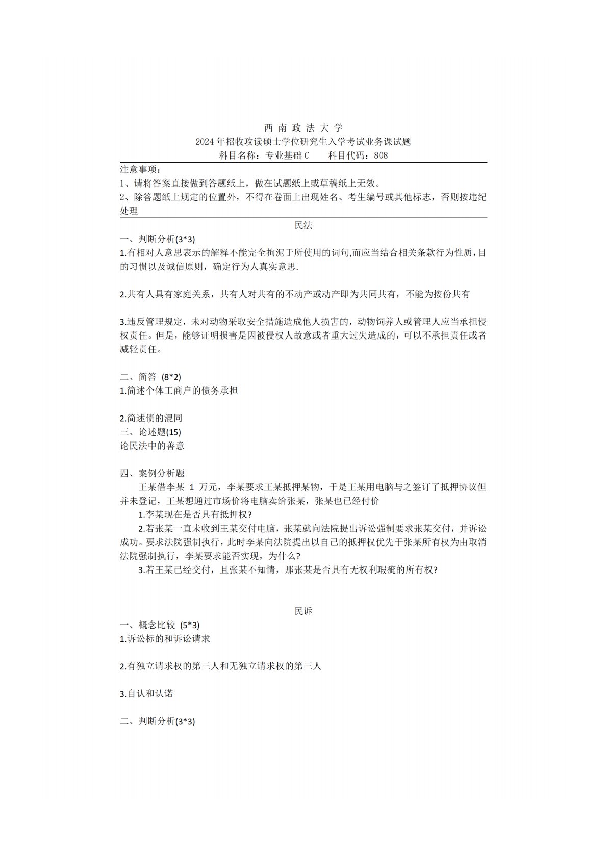 西南政法大学808专业基础C(民法学(民法总则、人格权法、物权法、合同法、侵权责任法)、经济法学(经济法基本理论、市场秩序规制法律制度)、民事诉讼法)2024年真题