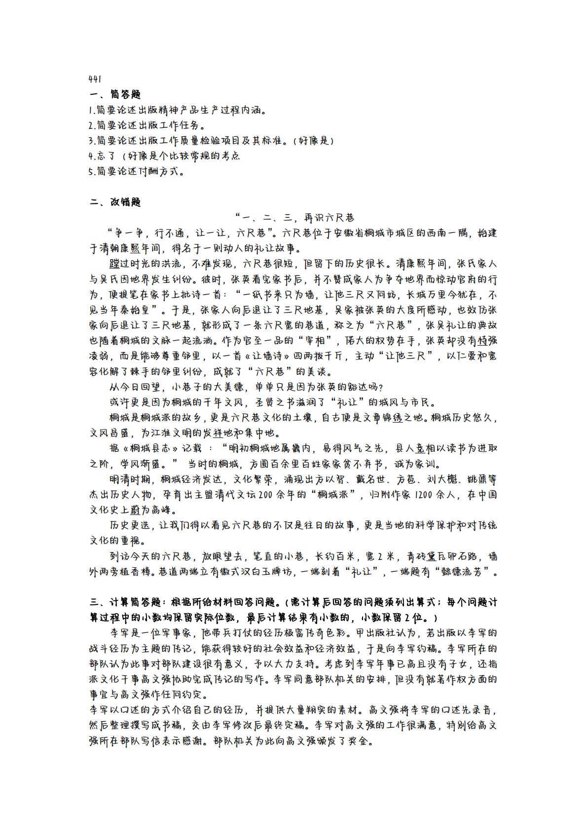441一、简答题1.简要论述出版精神产品生产过程内涵。2.简要论述出版工作任务。3.简要论述出版工作质量检验项目及其标准。(好像是)4.忘了(好像是个比较常规的考点5.简要论述付酬方式。二、改错题“一、二、三,再识六尺巷“争一争,行不通,让一让,六尺巷”。六尺巷位于安徽省桐城市城区的西南一隅,始建于清朝康熙年间,得名于一则动人的礼让故事。蹚过时光的洪流,不难发现,六尺巷很短,但留下的历史很长。清康熙年间,张氏家人与吴氏因地界发生纠纷。彼时,张英看完家书后,并不赞成家人为争夺地界而惊动官府的行为,便提笔在家书上批诗一首:“一纸书来只为墙,让他三尺又何妨,长城万里今犹在,不见当年秦始皇”。于是,张...
