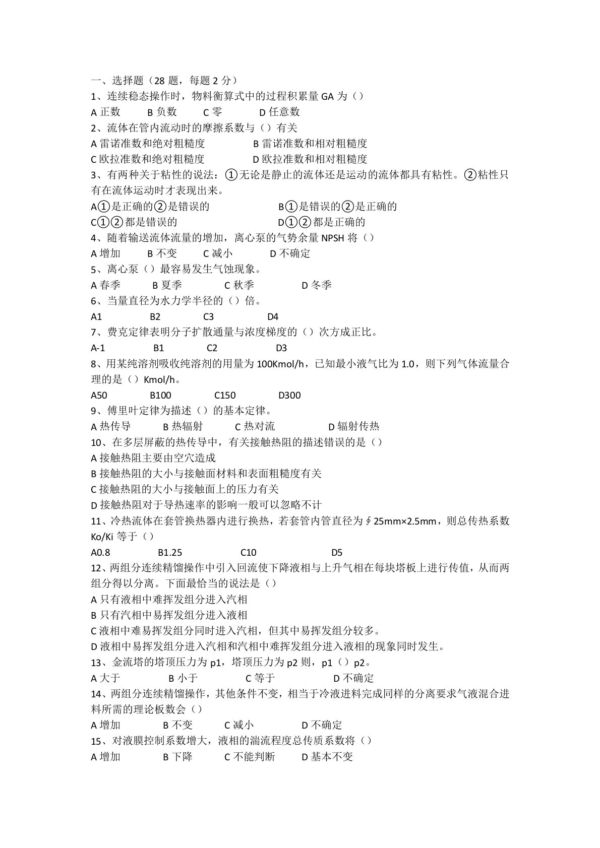 一、选择题(28题,每题2分)1、连续稳态操作时,物料衡算式中的过程积累量GA为()A正数B负数C零D任意数2、流体在管内流动时的摩擦系数与()有关A雷诺准数和绝对粗糙度B雷诺准数和相对粗糙度C欧拉准数和绝对粗糙度D欧拉准数和相对粗糙度3、有两种关于粘性的说法:①无论是静止的流体还是运动的流体都具有粘性。②粘性只有在流体运动时才表现出来。A①是正确的②是错误的B①是错误的②是正确的C①②都是错误的D①②都是正确的4、随着输送流体流量的增加,离心泵的气势余量NPSH将()A增加B不变C减小D不确定5、离心泵()最容易发生气蚀现象。A春季B夏季C秋季D冬季6、当量直径为水力学半径的()倍。A1B2...