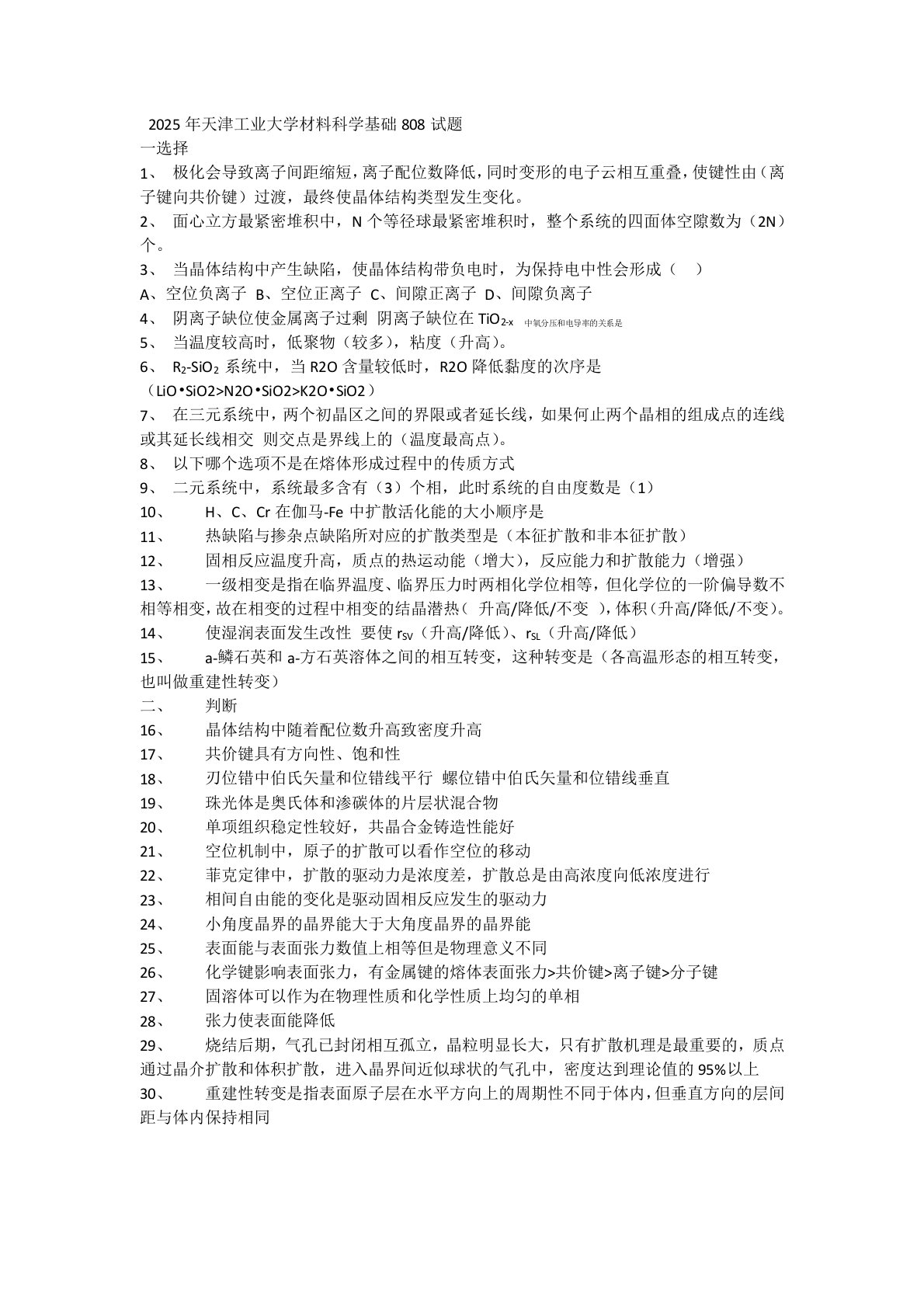 天津工业大学808材料科学基础2025年真题(完整回忆版)