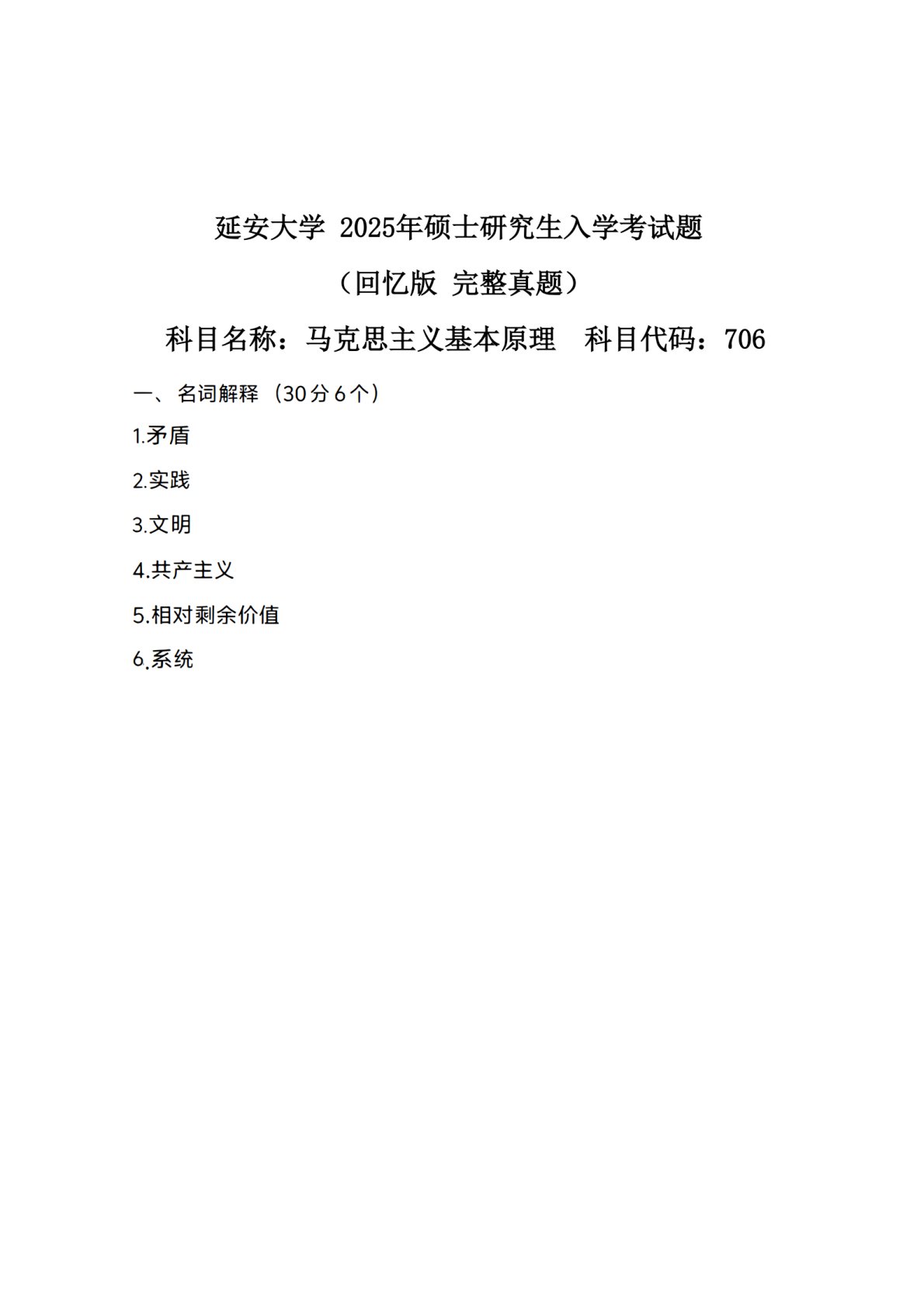 延安大学706马克思主义基本原理2025年真题(完整回忆版)
