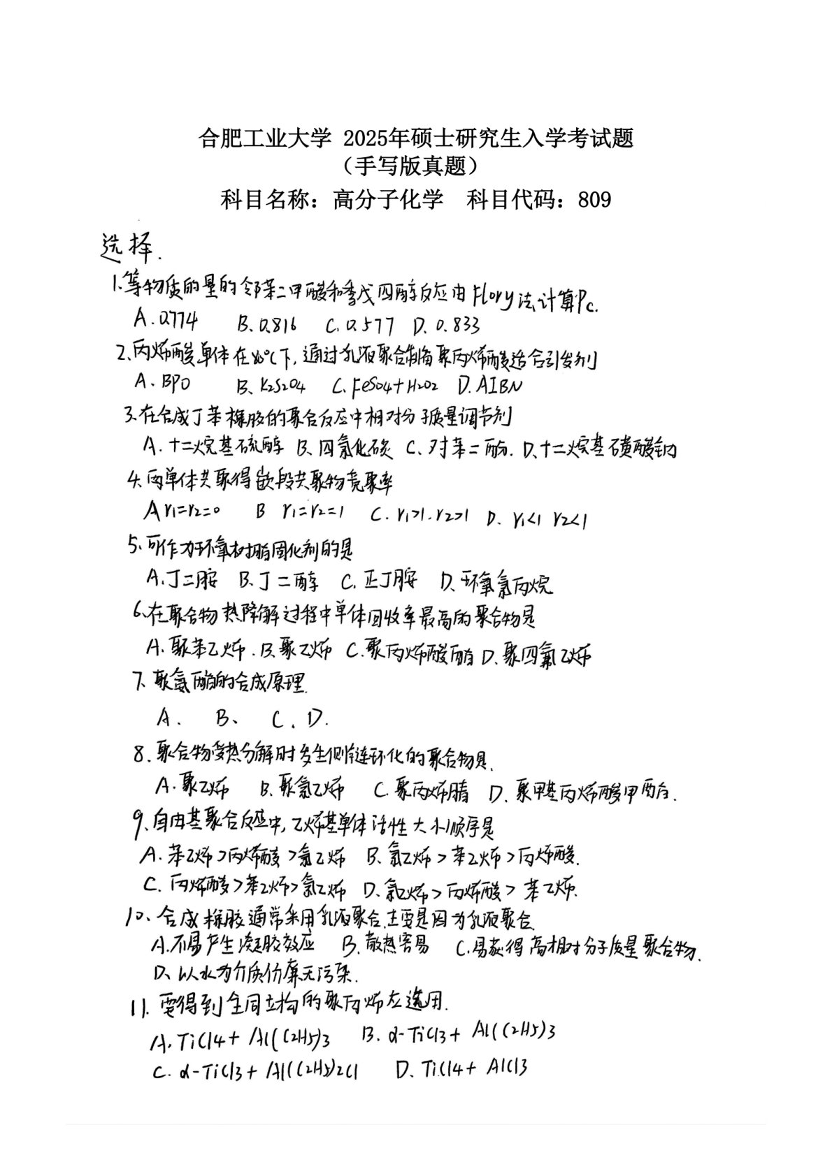 合肥工业大学809高分子化学2025年真题(完整回忆手写版)