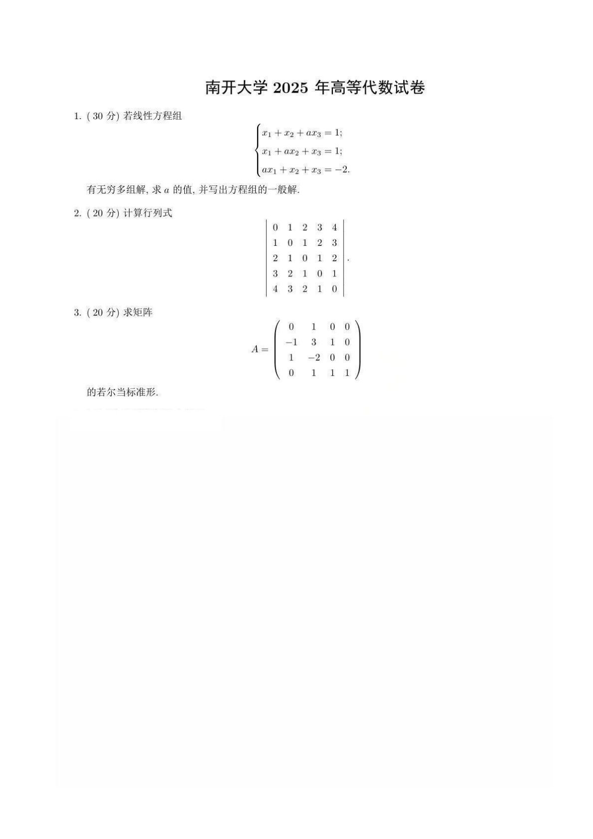 南开大学801高等代数2025年真题(回忆版)
