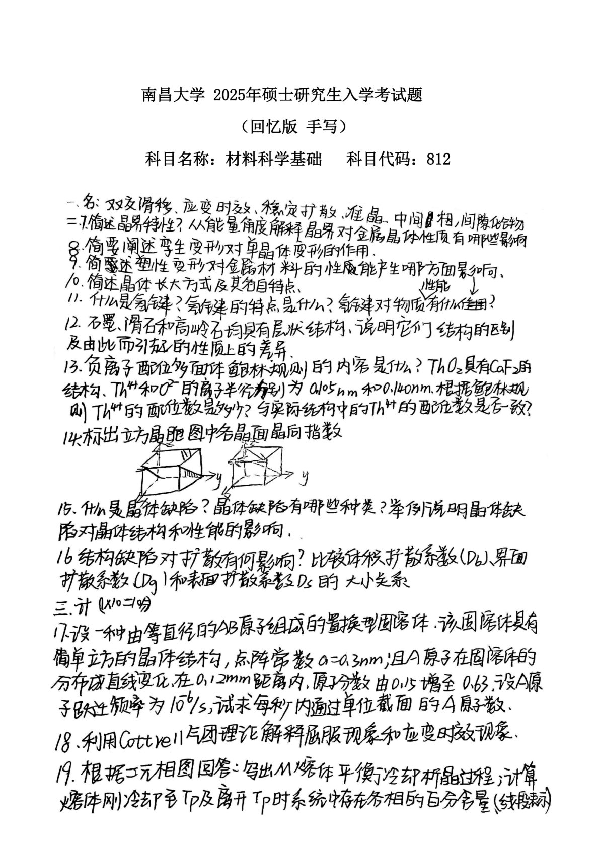 南昌大学812材料科学基础2025年真题(完整回忆版)