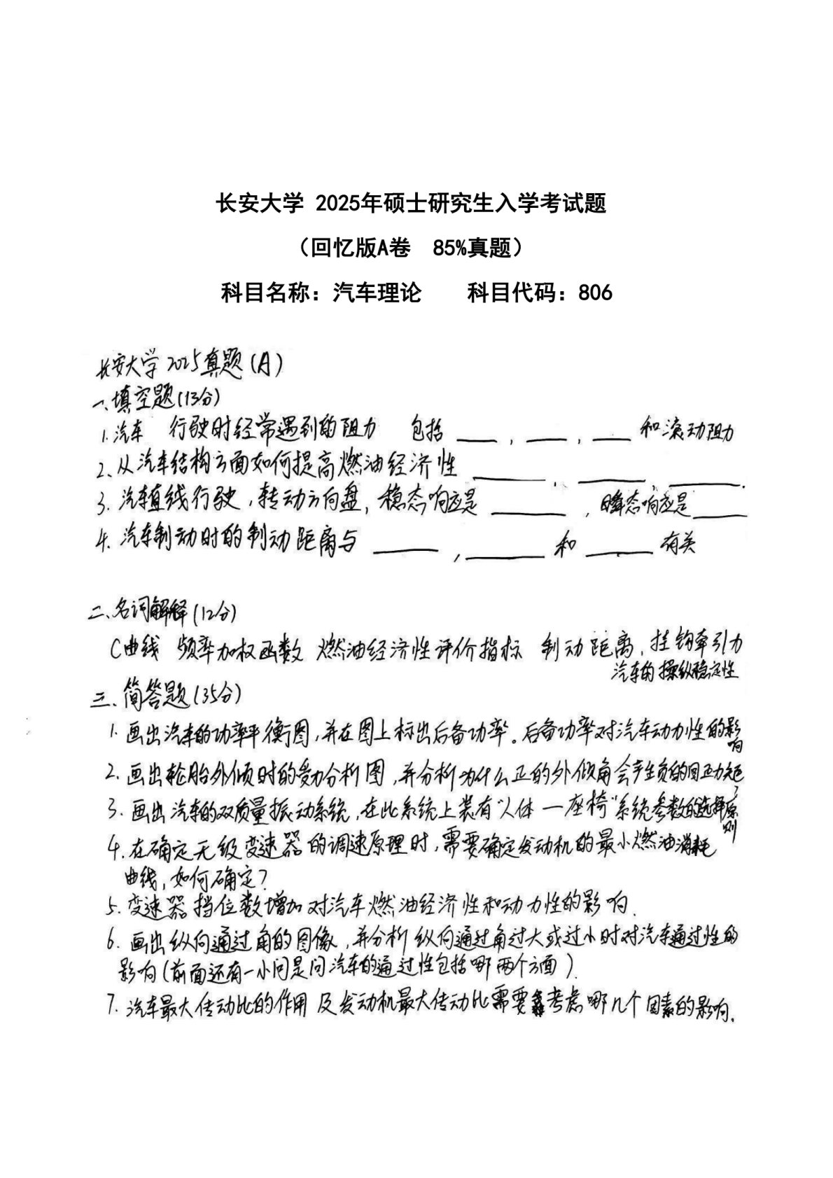 长安大学806汽车理论2025年真题A卷(85%回忆手写版,填空缺一道,无计算题)