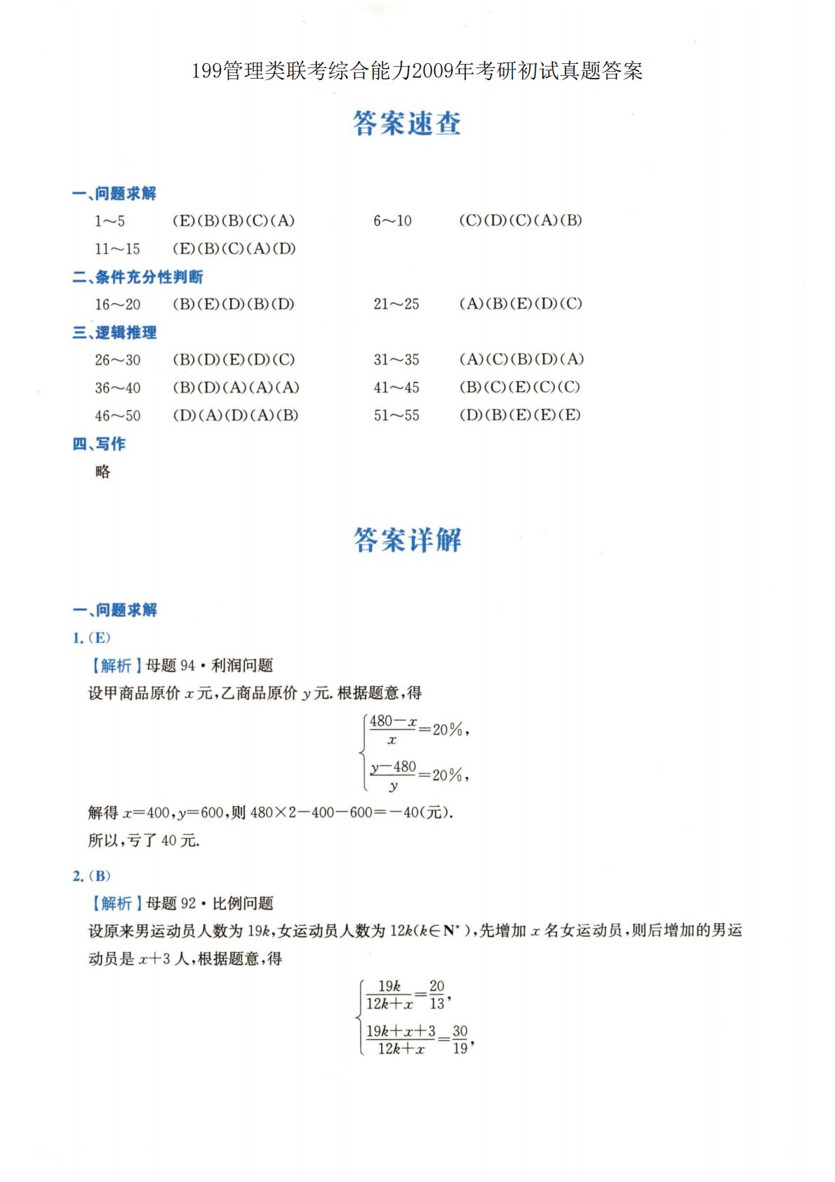 199管理类联考综合能力2009年考研初试真题答案