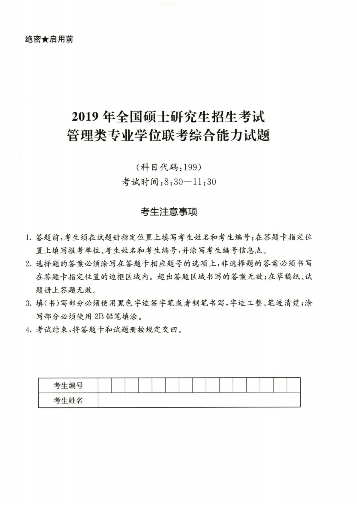绝密*启用前2019年全国硕士研究生招生考试管理类专业学位联考综合能力试题(科目代码:199)考试时间:8:30-11:30考生注意事项1.答题前,考生须在试题册指定位置上填写考生姓名和考生编号;在答题卡指定位置上填写报考单位、考生姓名和考生编号,并涂写考生编号信息点。2.选择题的答案必须涂写在答题卡相应题号的选项上,非选择题的答案必须书写在答题卡指定位置的边框区域内。超出答题区域书写的答案无效;在草稿纸、试题册上答题无效。3.填(书)写部分必须使用黑色宇迹签宇笔或者钢笔书写,宇迹工整、笔迹清楚;涂写部分必须使用2B铅笔填涂。4.考试结束,将答题卡和试题册按规定交回。考生编号考生姓名IIIII...