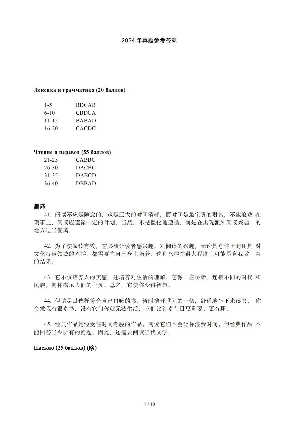 2024年真题参考答案Лексикаиграмматика(20баллов)1-5BDCAB6-10CBDCA11-15BABAD16-20CACDCЧтениеиперевод(55баллов)21-25CABBC26-30DACBC31-35DABCD36-40DBBAD翻译41.阅读不应是随意的。这是巨大的时间消耗,而时间是最宝贵的财富,不能浪费在琐事上。阅读应遵循一定的计划,当然,不是僵化地遵循,而是在出现额外阅读兴趣的地方适当偏离。42.为了使阅读有效,它必须让读者感兴趣。对阅读的兴趣,无论是总体上的还是对文化特定领域的兴趣,都需要在自己身上培养。这种兴趣在很大程度上可能是自我教...