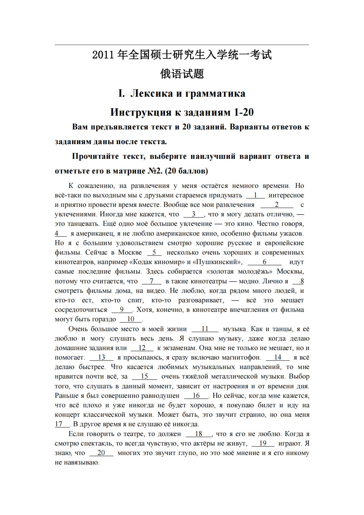 2011年全国硕士研究生入学统一考试俄语试题I.ЛексикаиграмматикаИнструкциякзаданиям1-20Вампредъявляетсятексти20заданий.Вариантыответовкзаданиямданыпослетекста.Прочитайтетекст,выберитенаилучшийвариантответаиотметьтееговматрице№2.(20баллов)Ксожалению,наразвлеченияуменяостаётсянемноговремени.Новсё-такиповыходныммысдрузьямис...