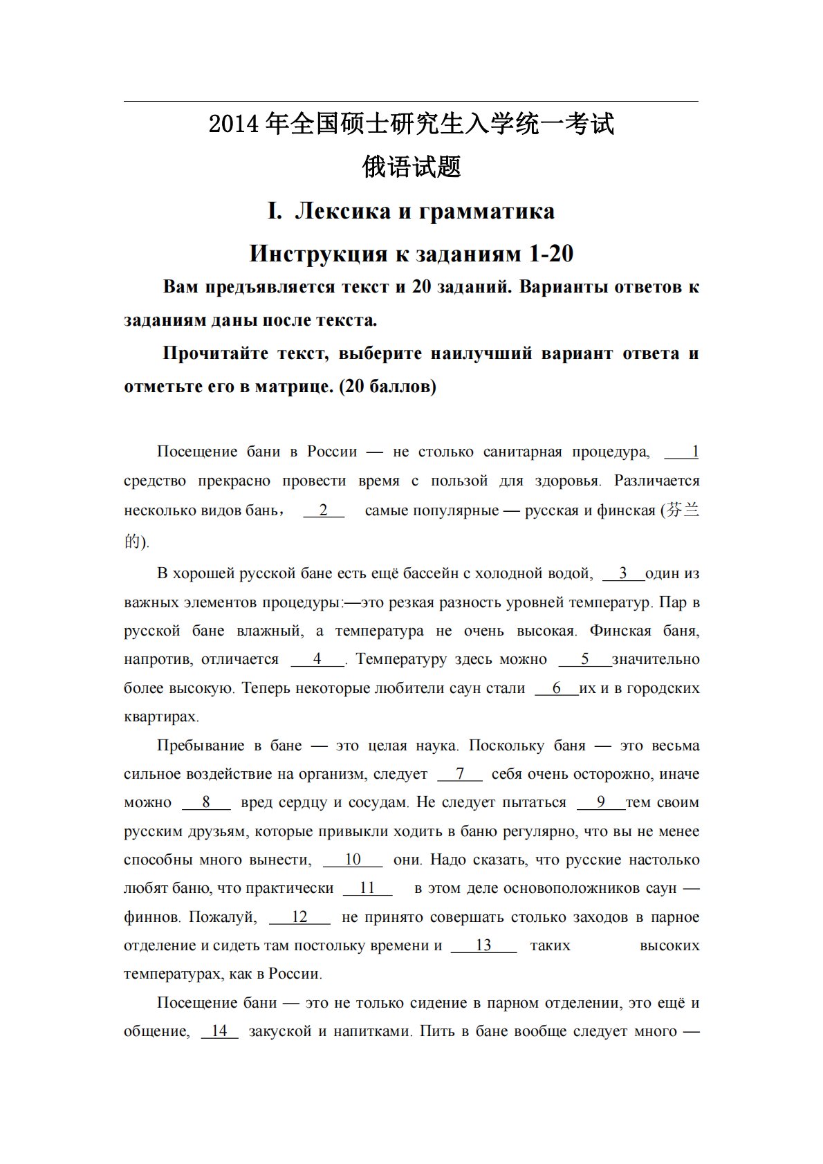 2014年全国硕士研究生入学统一考试俄语试题I.ЛексикаиграмматикаИнструкциякзаданиям1-20Вампредъявляетсятексти20заданий.Вариантыответовкзаданиямданыпослетекста.Прочитайтетекст,выберитенаилучшийвариантответаиотметьтееговматрице.(20баллов)ПосещениебанивРоссии—нестолькосанитарнаяпроцедура,1средствопрекраснопровестивремясполь...