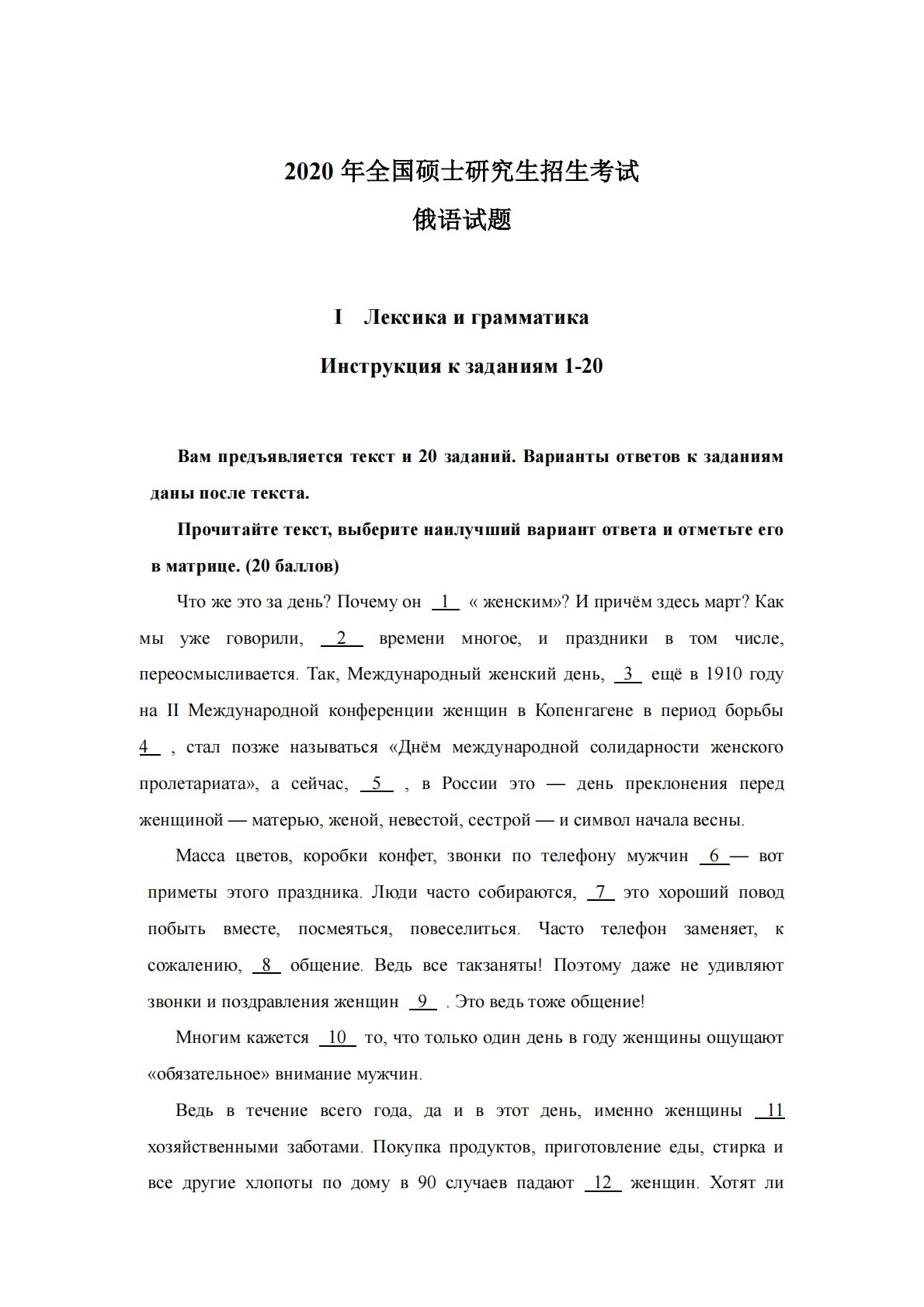 2020年全国硕士研究生招生考试俄语试题IЛексикаиграмматикаИнструкциякзаданиям1-20Вампредъявляетсятексти20заданий.Вариантыответовкзаданиямданыпослетекста.Прочитайтетекст,выберитенаилучшийвариантответаиотметьтееговматрице.(20баллов)Чтожеэтозадень?Почемуон1«женским»?Ипричёмздесьмарт?Какмыужеговорили,2временимногое,ипразд...