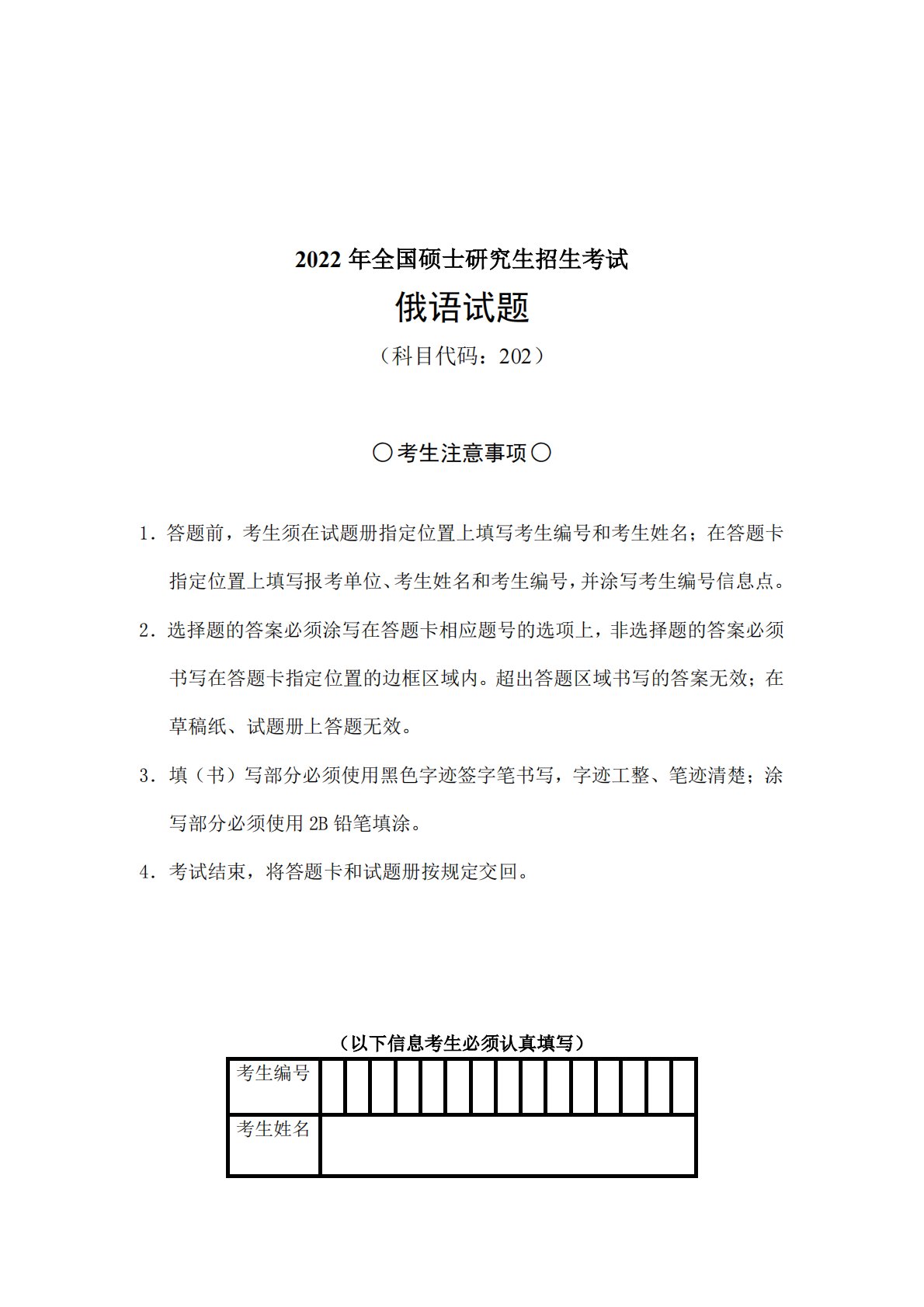 2022年全国硕士研究生招生考试俄语试题(科目代码:202)○考生注意事项○1.答题前,考生须在试题册指定位置上填写考生编号和考生姓名;在答题卡2.选择题的答案必须涂写在答题卡相应题号的选项上,非选择题的答案必须指定位置上填写报考单位、考生姓名和考生编号,并涂写考生编号信息点。书写在答题卡指定位置的边框区域内。超出答题区域书写的答案无效;在草稿纸、试题册上答题无效。3.填(书)写部分必须使用黑色字迹签字笔书写,字迹工整、笔迹清楚;涂写部分必须使用2B铅笔填涂。4.考试结束,将答题卡和试题册按规定交回。(以下信息考生必须认真填写)考生编号考生姓名ⅠЛексикаиграмматикаИнстру...
