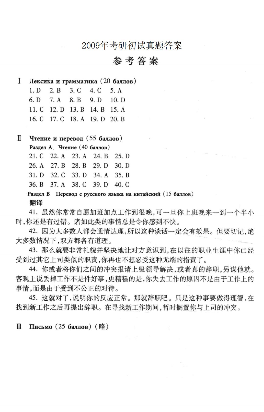 202俄语2009年考研初试真题参考答案