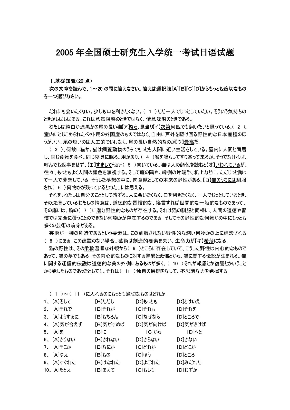 2005年全国硕士研究生入学统一考试日语试题Ⅰ.基礎知識(20点)次の文章を読んで、1~20の問に答えなさい。答えは選択肢[A][B][C][D]からもっとも適切なものを一つ選びなさい。だれにも会いたくない。少しも口を利きたくない。( 1 )ただ一人でじっとしていたい。そういう気持ちのときがしばしばある。これは意気阻喪のときではなく,情意沈潜のときである。わたしは純白か漆黒かの尾の長い猫【ア】なら、見当り【イ】次第何匹でも飼いたいと思っている。( 2 )、室内にとじこめられたペット用の外国産のものではなく、自由に戸外を駆け回る野性的な日本産種のほうがいい。尾の短いのは人工的でいけなく、尾の長い...
