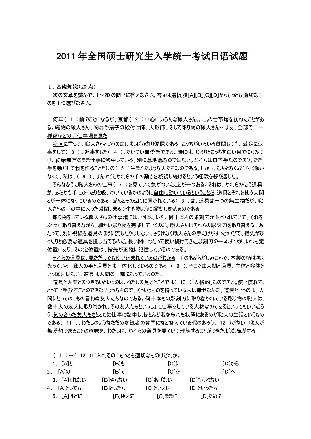 2011年全国硕士研究生入学统一考试日语试题Ⅰ.基礎知識(20点)次の文章を読んで、1~20の問いに答えなさい。答えは選択肢[A][B][C][D]からもっとも適切なものを1つ選びなさい。何年( 1 )前のことになるが、京都( 2 )中心にいろんな職人さん(手艺人)の仕事場を訪ねたことがある。織物の職人さん、陶器や扇子の絵付け師、人形師、そして彫り物の職人さん…まあ、全部で二十種類ほどの手仕事場を見た。率直に言って、職人さんというのはしばしばかなり偏屈である。こっちがいろいろ質問しても、満足に返事をして( 3 )。返事をした( 4 )、たいてい無愛想である。時には、じろりとこっちを白い目でにら...
