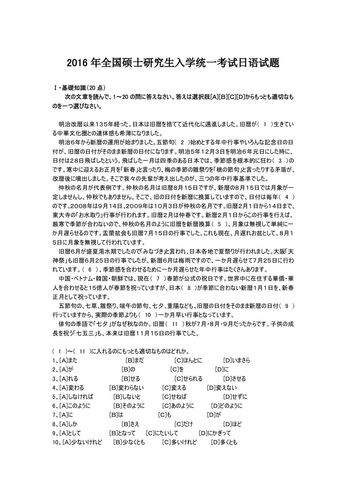 2016年全国硕士研究生入学统一考试日语试题Ⅰ・基礎知識(20点)次の文章を読んで、1~20の問に答えなさい。答えは選択肢[A][B][C][D]からもっとも適切なものを一つ選びなさい。明治改暦以来135年経った。日本は旧暦を捨てて近代化に邁進しました。旧暦が( 1 )生きている中華文化圏との連体感も希薄になりました。明治6年から新暦の運用が始まりました。五節句( 2 )始めとする年中行事やいろんな記念日の日付が、旧暦の日付がそのまま新暦の日付になります。明治5年12月3日を明治6年元日にした時に、日付は28日飛ばしたという。飛ばした一月は四季のある日本では、季節感を根本的に狂わ( 3 )ので...