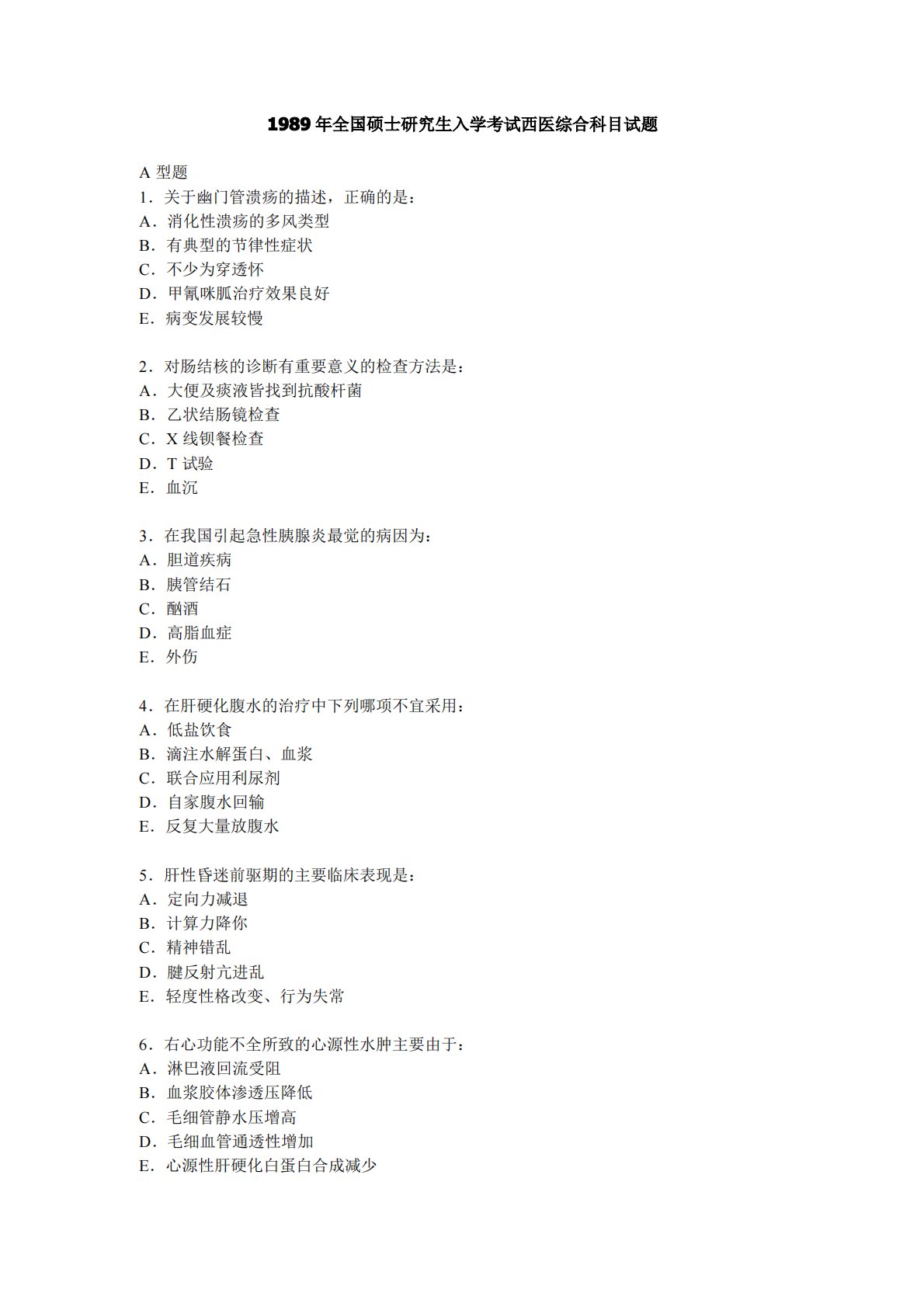1989年全国硕士研究生入学考试西医综合科目试题A型题1.关于幽门管溃疡的描述,正确的是:A.消化性溃疡的多风类型B.有典型的节律性症状C.不少为穿透怀D.甲氰咪胍治疗效果良好E.病变发展较慢2.对肠结核的诊断有重要意义的检查方法是:A.大便及痰液皆找到抗酸杆菌B.乙状结肠镜检查C.X线钡餐检查D.T试验E.血沉3.在我国引起急性胰腺炎最觉的病因为:A.胆道疾病B.胰管结石C.酗酒D.高脂血症E.外伤4.在肝硬化腹水的治疗中下列哪项不宜采用:A.低盐饮食B.滴注水解蛋白、血浆C.联合应用利尿剂D.自家腹水回输E.反复大量放腹水5.肝性昏迷前驱期的主要临床表现是:A.定向力减退B.计算力降你C....