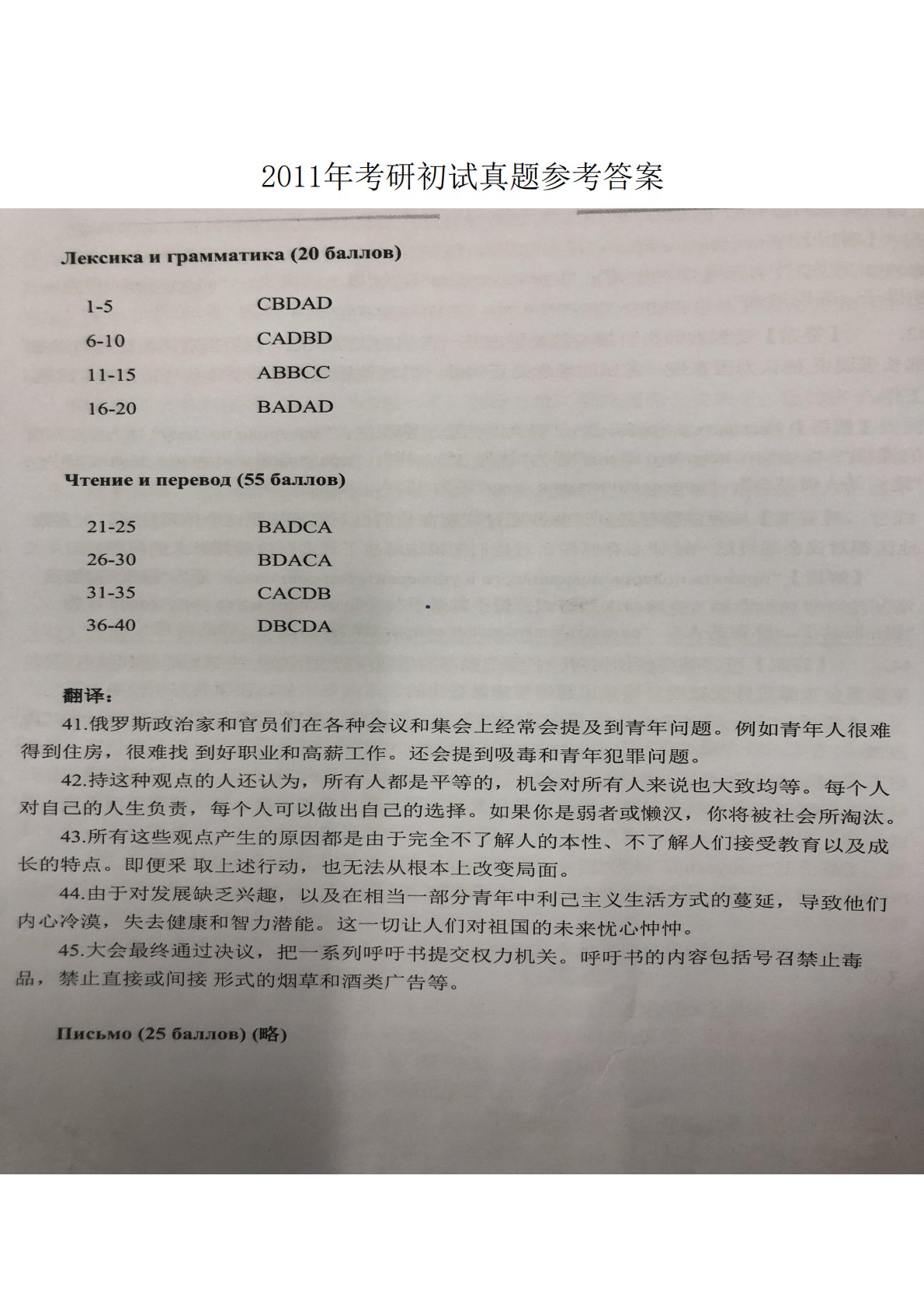 202俄语2011年考研初试真题参考答案
