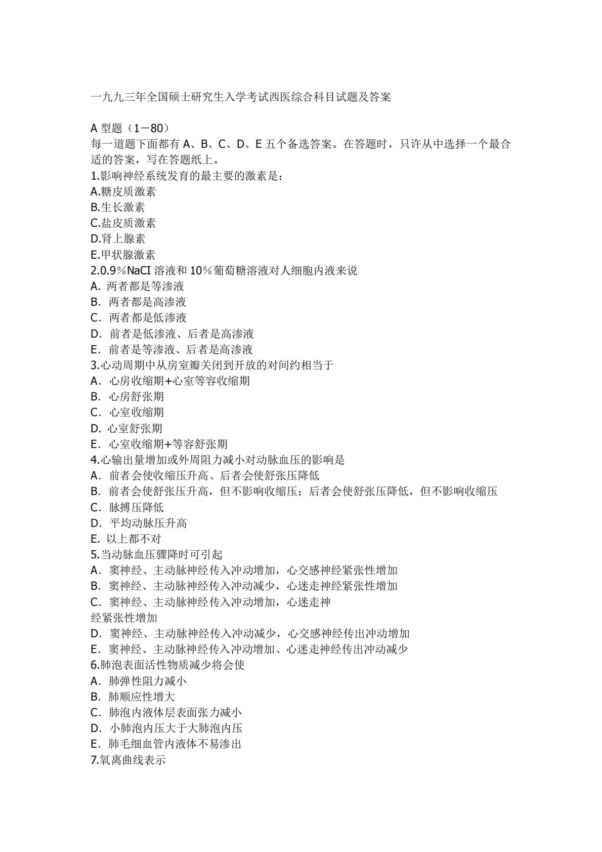一九九三年全国硕士研究生入学考试西医综合科目试题及答案A型题(1-80)每一道题下面都有A、B、C、D、E五个备选答案。在答题时,只许从中选择一个最合适的答案,写在答题纸上。1.影响神经系统发育的最主要的激素是:A.糖皮质激素B.生长激素C.盐皮质激素D.肾上腺素E.甲状腺激素2.0.9%NaCI溶液和10%葡萄糖溶液对人细胞内液来说A.两者都是等渗液B.两者都是高渗液C.两者都是低渗液D.前者是低渗液、后者是高渗液E.前者是等渗液、后者是高渗液3.心动周期中从房室瓣关闭到开放的对间约相当于A.心房收缩期+心室等容收缩期B.心房舒张期C.心室收缩期D.心室舒张期E.心室收缩期+等容舒张期4.心...
