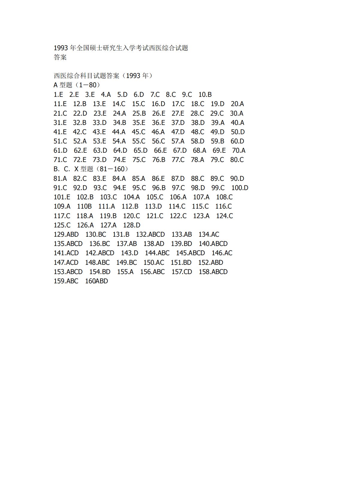 1993年全国硕士研究生入学考试西医综合试题答案西医综合科目试题答案(1993年)A型题(1-80)1.E2.E3.E4.A5.D6.D7.C8.C9.C10.B11.E12.B13.E14.C15.C16.D17.C18.C19.D20.A21.C22.D23.E24.A25.B26.E27.E28.C29.C30.A31.E32.B33.D34.B35.E36.E37.D38.D39.A40.A41.E42.C43.E44.A45.C46.A47.D48.C49.D50.D51.C52.A53.E54.A55.C56.C57.A58.D59.B60.D61.D62.E63.D64.D65....