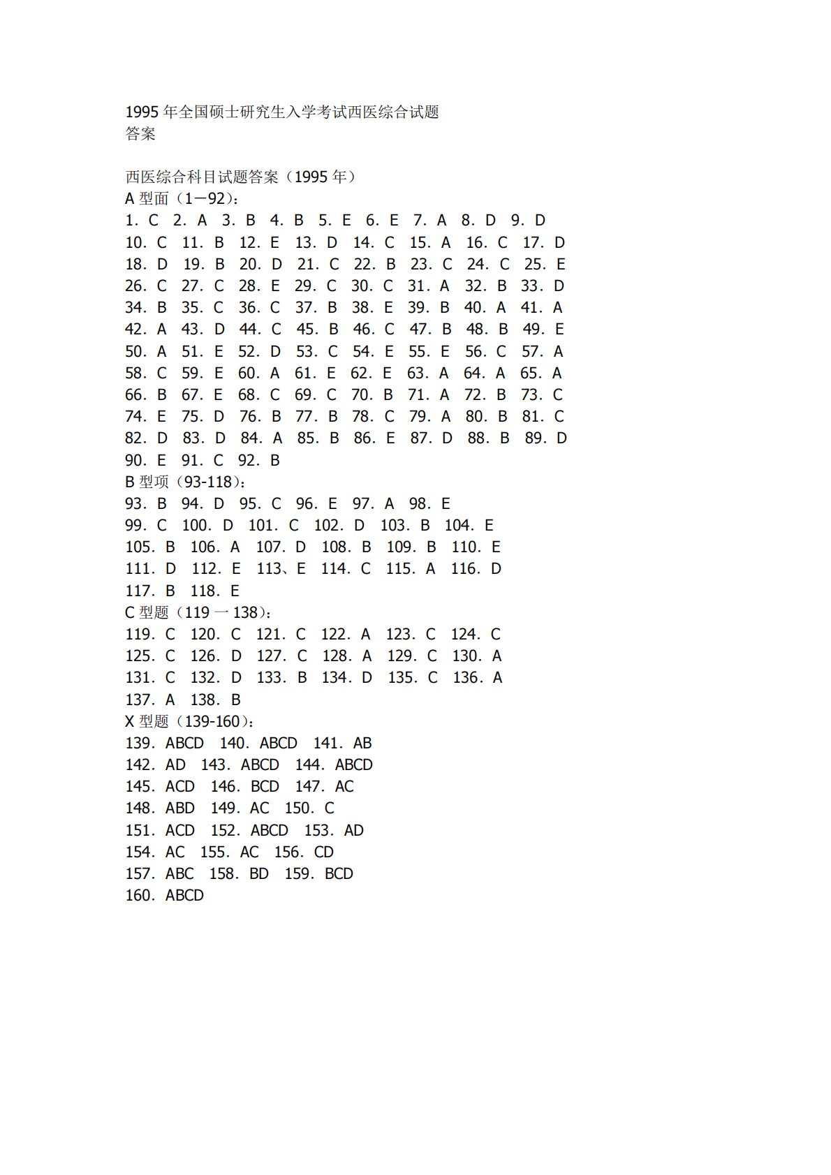 1995年全国硕士研究生入学考试西医综合试题答案西医综合科目试题答案(1995年)A型面(1-92):1.C2.A3.B4.B5.E6.E7.A8.D9.D10.C11.B12.E13.D14.C15.A16.C17.D18.D19.B20.D21.C22.B23.C24.C25.E26.C27.C28.E29.C30.C31.A32.B33.D34.B35.C36.C37.B38.E39.B40.A41.A42.A43.D44.C45.B46.C47.B48.B49.E50.A51.E52.D53.C54.E55.E56.C57.A58.C59.E60.A61.E62.E63.A64.A65...