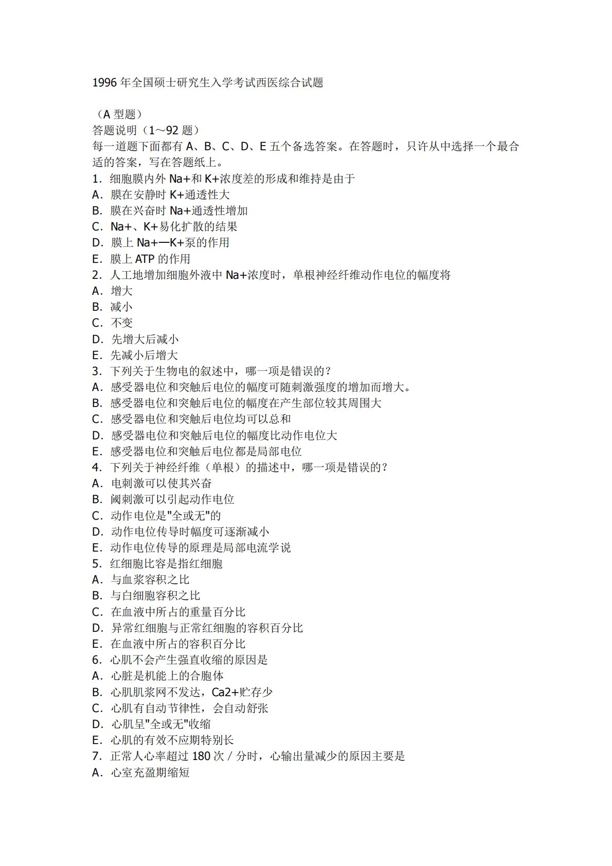 1996年全国硕士研究生入学考试西医综合试题(A型题)答题说明(1~92题)每一道题下面都有A、B、C、D、E五个备选答案。在答题时,只许从中选择一个最合适的答案,写在答题纸上。1.细胞膜内外Na+和K+浓度差的形成和维持是由于A.膜在安静时K+通透性大B.膜在兴奋时Na+通透性增加C.Na+、K+易化扩散的结果D.膜上Na+—K+泵的作用E.膜上ATP的作用2.人工地增加细胞外液中Na+浓度时,单根神经纤维动作电位的幅度将A.增大B.减小C.不变D.先增大后减小E.先减小后增大3.下列关于生物电的叙述中,哪一项是错误的?A.感受器电位和突触后电位的幅度可随刺激强度的增加而增大。B.感受器电位...
