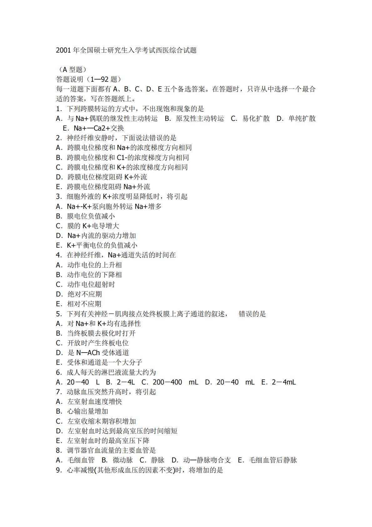 2001年全国硕士研究生入学考试西医综合试题(A型题)答题说明(1—92题)每一道题下面都有A、B、C、D、E五个备选答案。在答题时,只许从中选择一个最合适的答案,写在答题纸上。1.下列跨膜转运的方式中,不出现饱和现象的是A.与Na+偶联的继发性主动转运B.原发性主动转运C.易化扩散D.单纯扩散E.Na+—Ca2+交换2.神经纤维安静时,下面说法错误的是A.跨膜电位梯度和Na+的浓度梯度方向相同B.跨膜电位梯度和C1-的浓度梯度方向相同C.跨膜电位梯度和K+的浓度梯度方向相同D.跨膜电位梯度阻碍K+外流E.跨膜电位梯度阻碍Na+外流3.细胞外液的K+浓度明显降低时,将引起A.Na+-K+泵向胞...