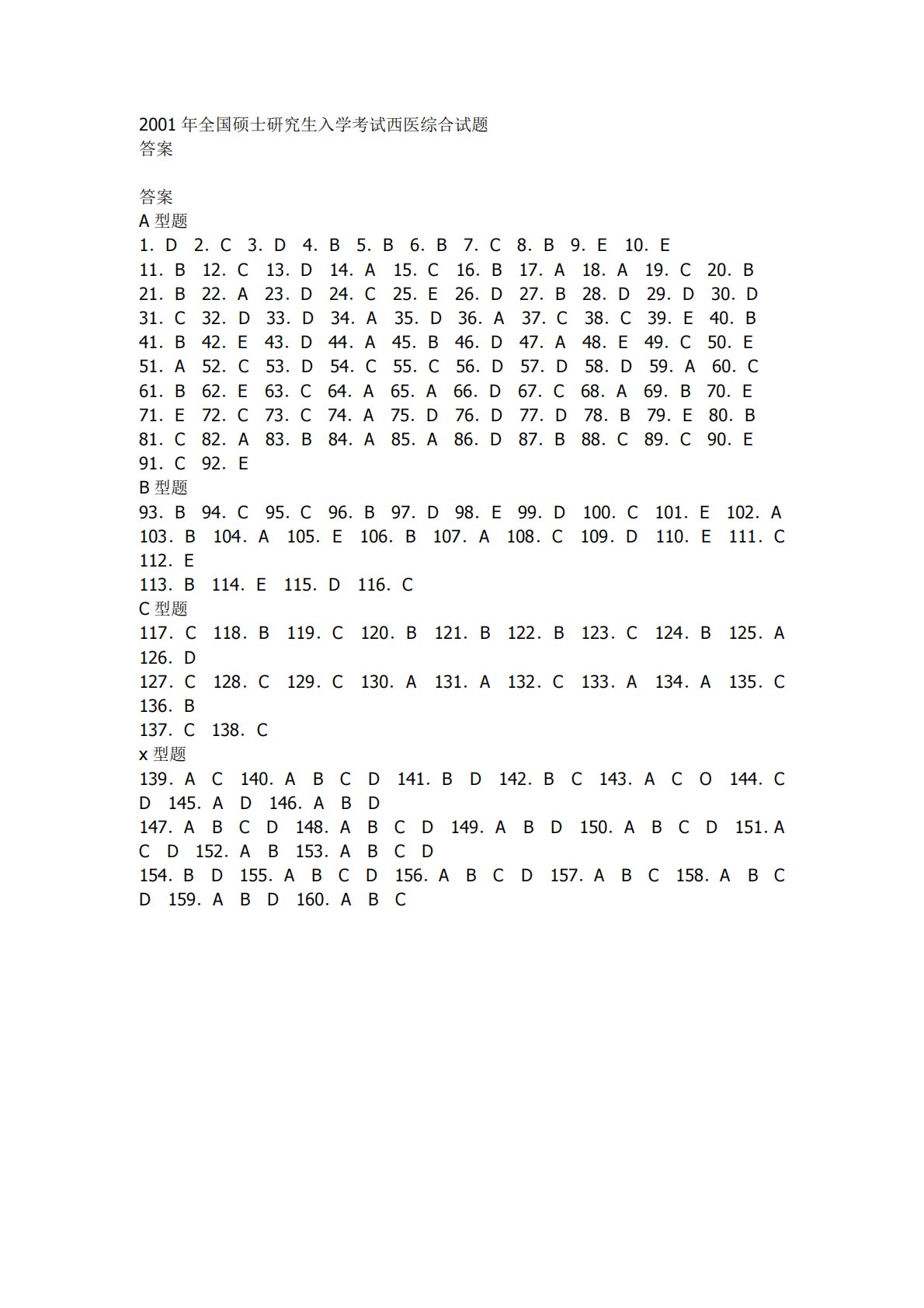 2001年全国硕士研究生入学考试西医综合试题答案答案A型题1.D2.C3.D4.B5.B6.B7.C8.B9.E10.E11.B12.C13.D14.A15.C16.B17.A18.A19.C20.B21.B22.A23.D24.C25.E26.D27.B28.D29.D30.D31.C32.D33.D34.A35.D36.A37.C38.C39.E40.B41.B42.E43.D44.A45.B46.D47.A48.E49.C50.E51.A52.C53.D54.C55.C56.D57.D58.D59.A60.C61.B62.E63.C64.A65.A66.D67.C68.A69.B70.E...
