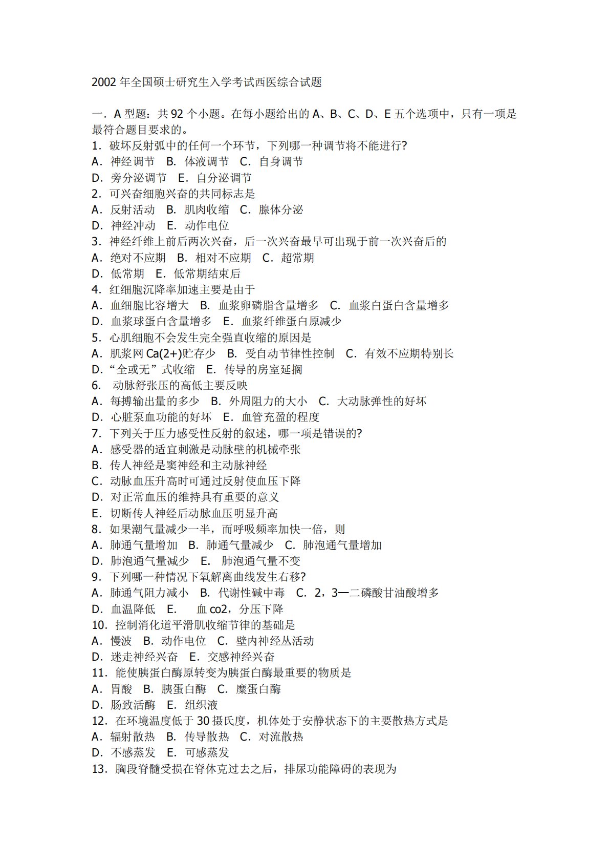 2002年全国硕士研究生入学考试西医综合试题一.A型题:共92个小题。在每小题给出的A、B、C、D、E五个选项中,只有一项是最符合题目要求的。1.破坏反射弧中的任何一个环节,下列哪一种调节将不能进行?A.神经调节B.体液调节C.自身调节D.旁分泌调节E.自分泌调节2.可兴奋细胞兴奋的共同标志是A.反射活动B.肌肉收缩C.腺体分泌D.神经冲动E.动作电位3.神经纤维上前后两次兴奋,后一次兴奋最早可出现于前一次兴奋后的A.绝对不应期B.相对不应期C.超常期D.低常期E.低常期结束后4.红细胞沉降率加速主要是由于A.血细胞比容增大B.血浆卵磷脂含量增多C.血浆白蛋白含量增多D.血浆球蛋白含量增多E....
