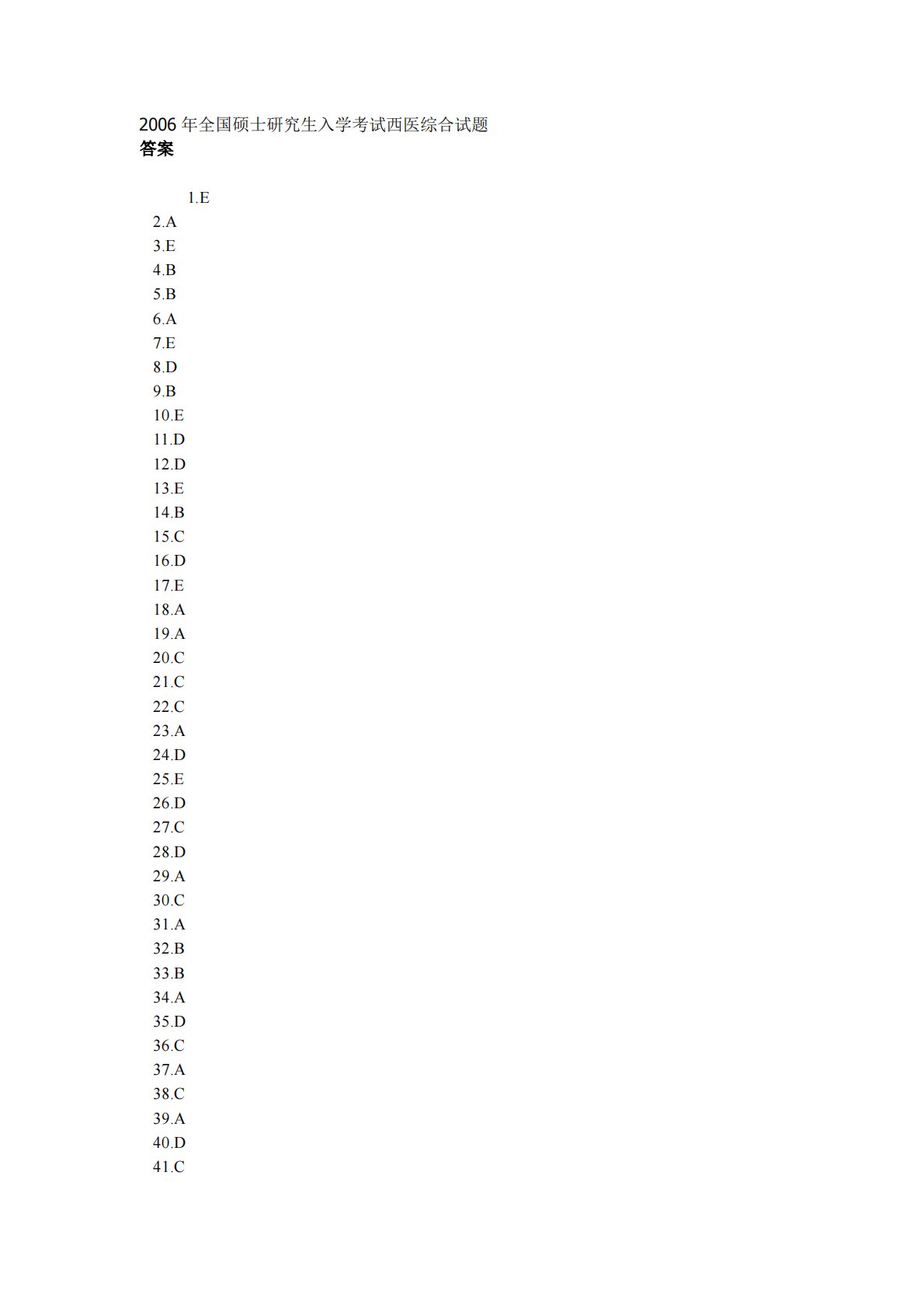 2006年全国硕士研究生入学考试西医综合试题答案1.E2.A3.E4.B5.B6.A7.E8.D9.B10.E11.D12.D13.E14.B15.C16.D17.E18.A19.A20.C21.C22.C23.A24.D25.E26.D27.C28.D29.A30.C31.A32.B33.B34.A35.D36.C37.A38.C39.A40.D41.C42.E43.D44.E45.E46.D47.A48.A49.A50.B51.D52.B53.B54.C55.A56.D57.E58.A59.B60.D61.E62.C63.C64.D65.A66.E67.C68.D69.A70.C71.B7...