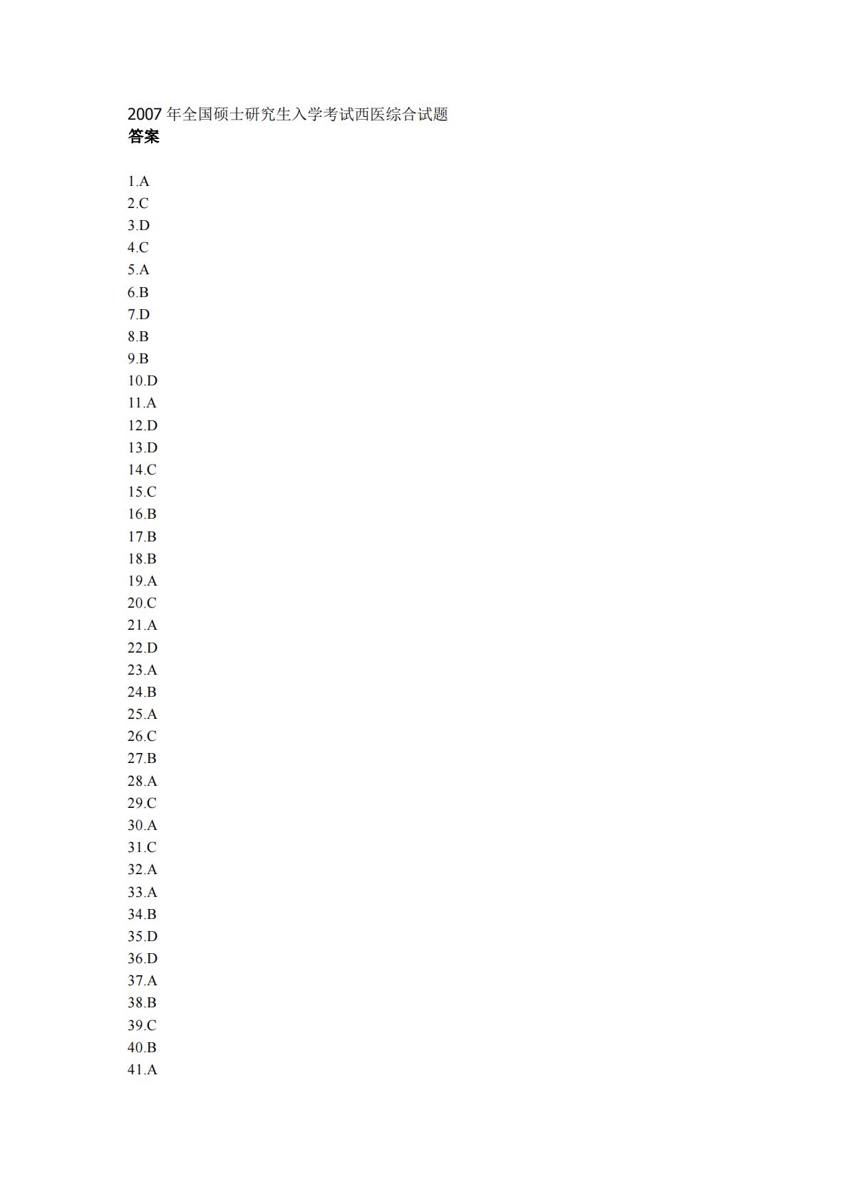 2007年全国硕士研究生入学考试西医综合试题答案1.A2.C3.D4.C5.A6.B7.D8.B9.B10.D11.A12.D13.D14.C15.C16.B17.B18.B19.A20.C21.A22.D23.A24.B25.A26.C27.B28.A29.C30.A31.C32.A33.A34.B35.D36.D37.A38.B39.C40.B41.A42.C43.A44.D45.D46.B47.B48.A49.A50.D51.A52.D53.B54.D55.C56.D57.D58.A59.B60.A61.D62.B63.A64.C65.A66.D67.C68.C69.B70.C71.C7...
