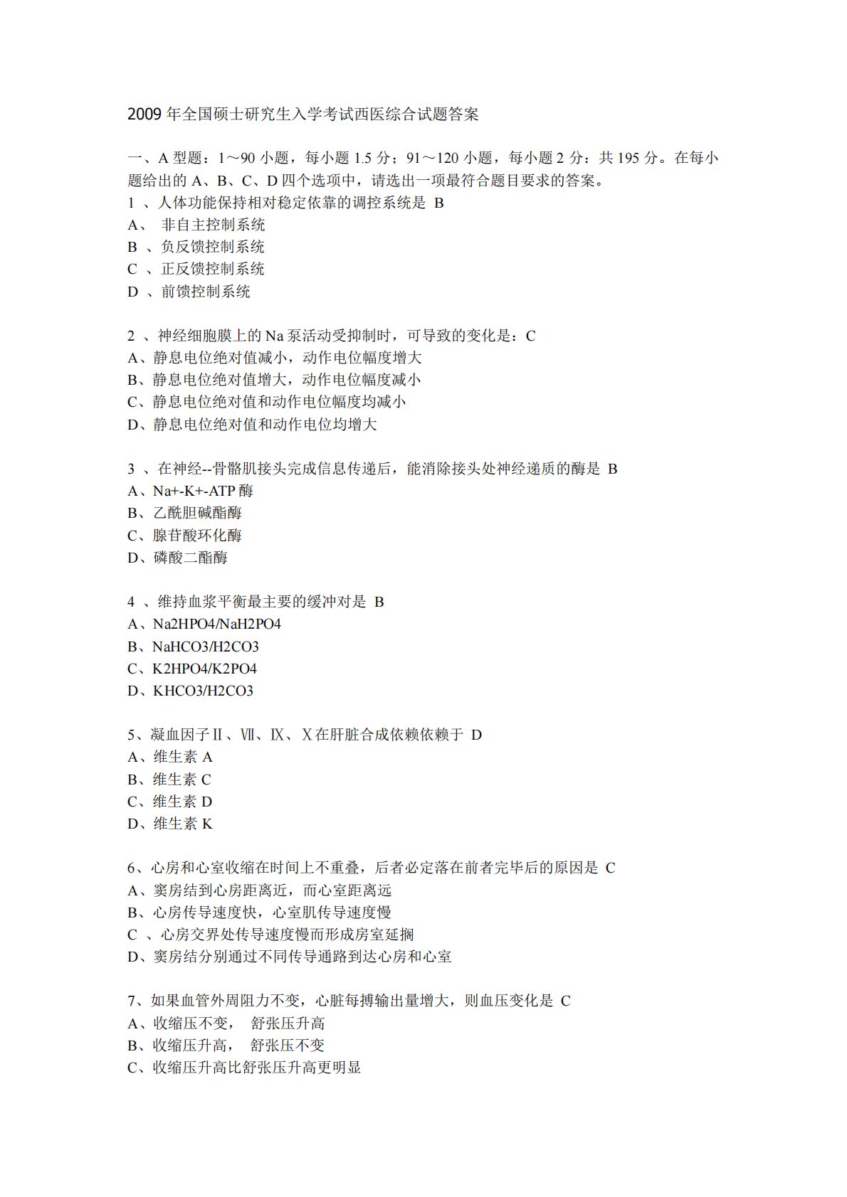 2009年全国硕士研究生入学考试西医综合试题答案一、A型题:1~90小题,每小题1.5分;91~120小题,每小题2分:共195分。在每小题给出的A、B、C、D四个选项中,请选出一项最符合题目要求的答案。1、人体功能保持相对稳定依靠的调控系统是BA、非自主控制系统B、负反馈控制系统C、正反馈控制系统D、前馈控制系统2、神经细胞膜上的Na泵活动受抑制时,可导致的变化是:CA、静息电位绝对值减小,动作电位幅度增大B、静息电位绝对值增大,动作电位幅度减小C、静息电位绝对值和动作电位幅度均减小D、静息电位绝对值和动作电位均增大3、在神经--骨骼肌接头完成信息传递后,能消除接头处神经递质的酶是BA、Na...